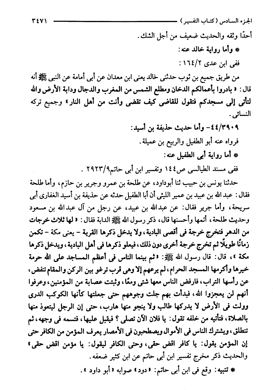 حَدَّثَنَا يونس بن حبيب ثنا أبو داود، عن طلحة بن عمرو وجرير بن حازم، وأما طلحة فقال: عبد الله بن عبيد بن عمير الليثيّ أن أَبا الطفيل حدثه عن حذيفة بن أسيد الغفاري أبي سريحة، وأما جرير فقال: عن عبد الله بن عبيد، عن رجل من آل عبد الله بن مسعود وحديث طلحة، أتمها وأحسنها قال، ذكر رسول الله - صلى الله عليه وسلم - الدابة فقال: "لها ثلاث خرجات من الدهر فتخرج خرجه في أقصى البادية، ولا يدخل ذكرها القرية - يعني مكة - تكمن زمانًا طويلًا ثم تخرج خرجة أخرى دون ذلك، فيعلو ذكرها في أهل البادية، ويدخل ذكرها مكة"، قال: قال رسول الله - صلى الله عليه وسلم -: "ثم بينما النَّاس في أعظم المساجد على الله حرمة خيرها وأكرمها المسجد الحرام، لم يرعهم إلَّا وهي قرب ترغو بين الركن والمقام تنفض، عن رأسها التراب، فارفض النَّاس معها شتى ومعًا، وثبتت عصابة من المُؤْمنين، وعرفوا أنهم لن يعجزوا الله، فبدأت بهم جلت وجوههم حتَّى جعلتها كأنها الكوكب الدرى وولت في الأرض لا يدركها طالب ولا ينجو منها هارب، حتَّى إن الرَّجل ليتعوذ منها بالصلاة، فتأتيه من خلفه تقول: يا فلان الآن تصلى؟ فيقبل عليها، فتسمه في وجهه، ثم تنطلق، ويشترك النَّاس في الأموال ويصطحبون في الأمصار يعرف المؤمن من الكافر حتَّى إن المؤمن يقول: يَا كافر اقض حقى، وحتى الكافر ليقول: يَا مؤمن اقض حقى" والحديث ذكر مخرج تفسير ابن أبي حاتم عن ابن كثير ضعفه.