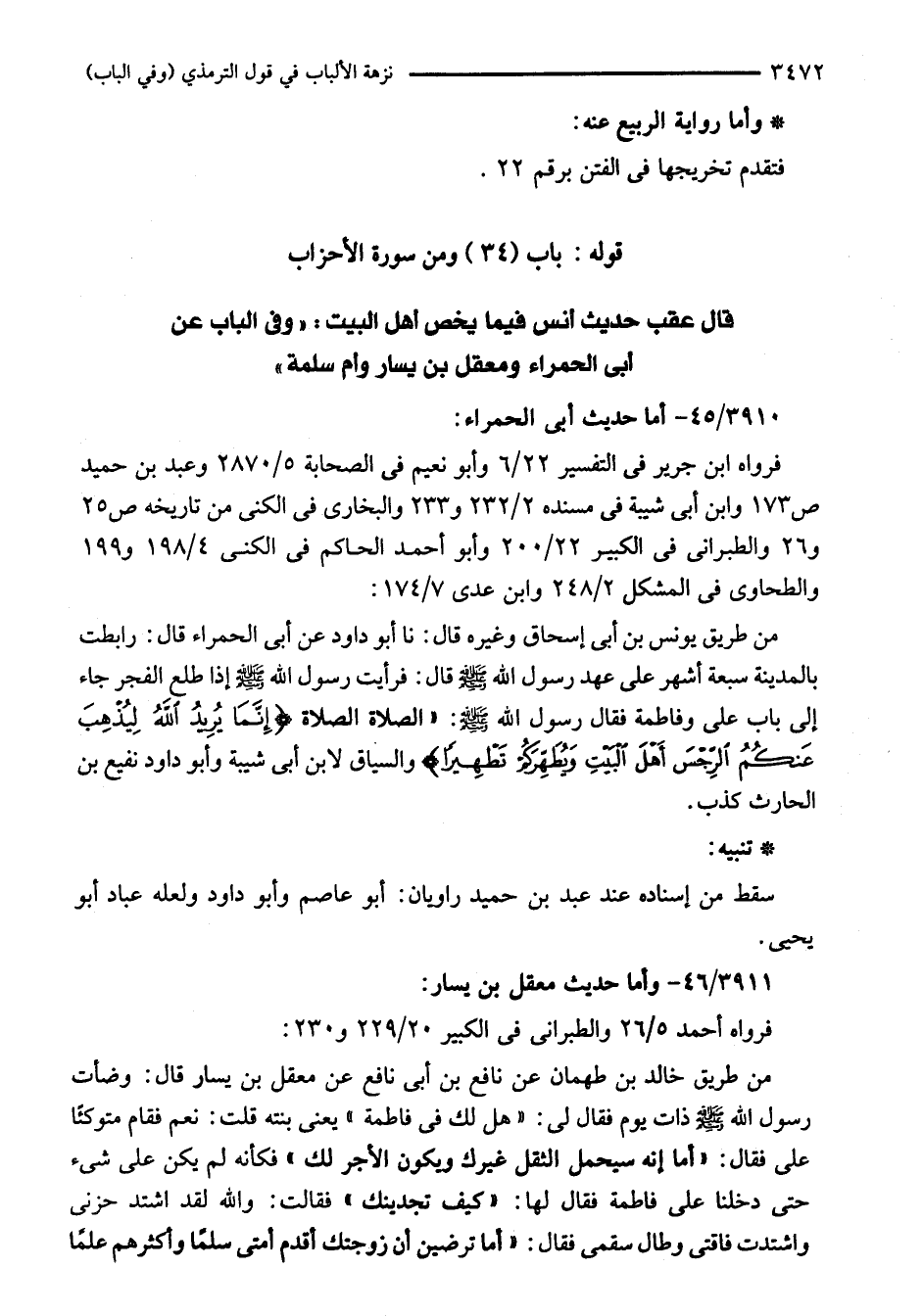 من طريق يونس بن أبي إسحاق وغيره قال: نا أبو داود عن أبي الحمراء قال: رابطت بالمدينة سبعة أشهر على عهد رسول الله - صلى الله عليه وسلم - قال: فرأيت رسول الله - صلى الله عليه وسلم - إذا طلع الفجر جاء إلى باب على وفاطمة فقال رسول الله - صلى الله عليه وسلم -: "الصلاة الصلاة {إِنَّمَا يُرِيدُ اللَّهُ لِيُذْهِبَ عَنْكُمُ الرِّجْسَ أَهْلَ الْبَيْتِ وَيُطَهِّرَكُمْ تَطْهِيرًا} والسياق لابن أبي شيبة وأبو داود نفيع بن الحارث كذب.