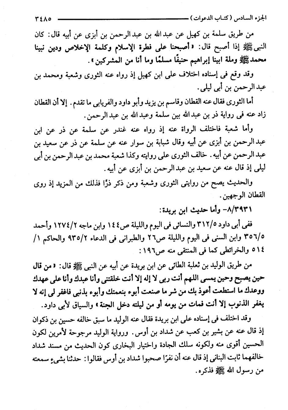 من طريق سلمة بن كهيل عن عبد الله بن عبد الرَّحْمَن بن أبزى عن أَبيه قال: كان النَّبِيّ - صلى الله عليه وسلم - إذا أصبح قال: "أصبحنا على فطرة الإِسلام وكلمة الإخلاص ودين نبينا محمد - صلى الله عليه وسلم - وملة ابينا إبراهيم حنيفاً مسلماً وما أنا من المشركين".