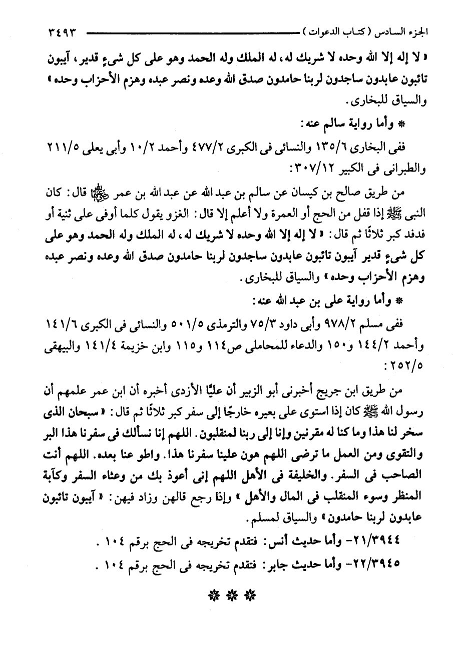 من طريق صالح بن كيسان عن سالم بن عبد الله عن عبد الله بن عمر - رضي الله عنهما - قال: كان النبي - صلى الله عليه وسلم - إذا قفل من الحج أو العمرة ولا أعلم إلَّا قال: الغزو يقول كلما أوفى على ثنية أو فدفد كبر ثلاثًا ثم قال: "لا إله إلَّا الله وحده لا شريك له، له الملك وله الحمد وهو على كل شىءٍ قدير آيبون تائبون عابدون ساجدون لربنا حامدون صدق الله وعده ونصر عبده وهزم الأحزاب وحده، والسياق للبخاري.