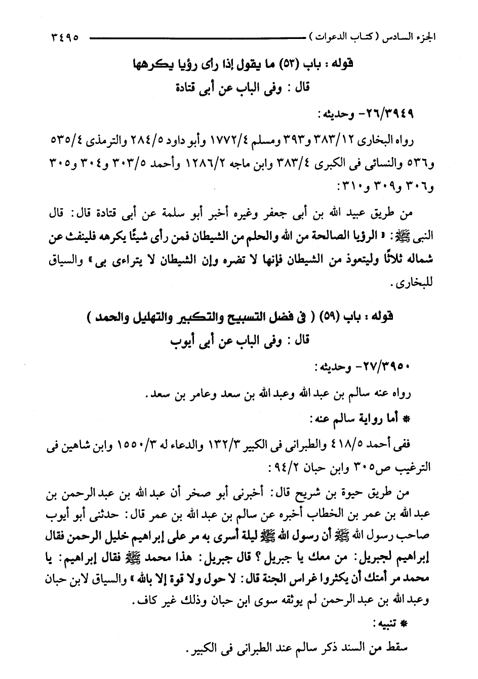 من طريق حيوة بن شريح قال: أخبرني أبو صخر أن عبد الله بن عبد الرَّحْمَن بن عبد الله بن عمر بن الخَطَّاب أخبره عن سالم بن عبد الله بن عمر قال: حَدَّثني أبو أَيُّوب صاحب رسول الله - صلى الله عليه وسلم - أن رسول الله - صلى الله عليه وسلم - ليلة أسرى به مر على إِبراهيم خليل الرَّحْمَن فقال إبراهيم لجبريل: من معك يا جبريل؟ قال جبريل: هذا محمَّد - صلى الله عليه وسلم - فقال إِبراهيم: يَا محمَّد مر أمتك أن يكثروا غراس الجنة قال: لا حول ولا قوة إلَّا بالله" والسياق لابن حبان وعبد الله بن عبد الرَّحْمَن لم يوثقه سوى ابن حبان وذلك غير كاف.