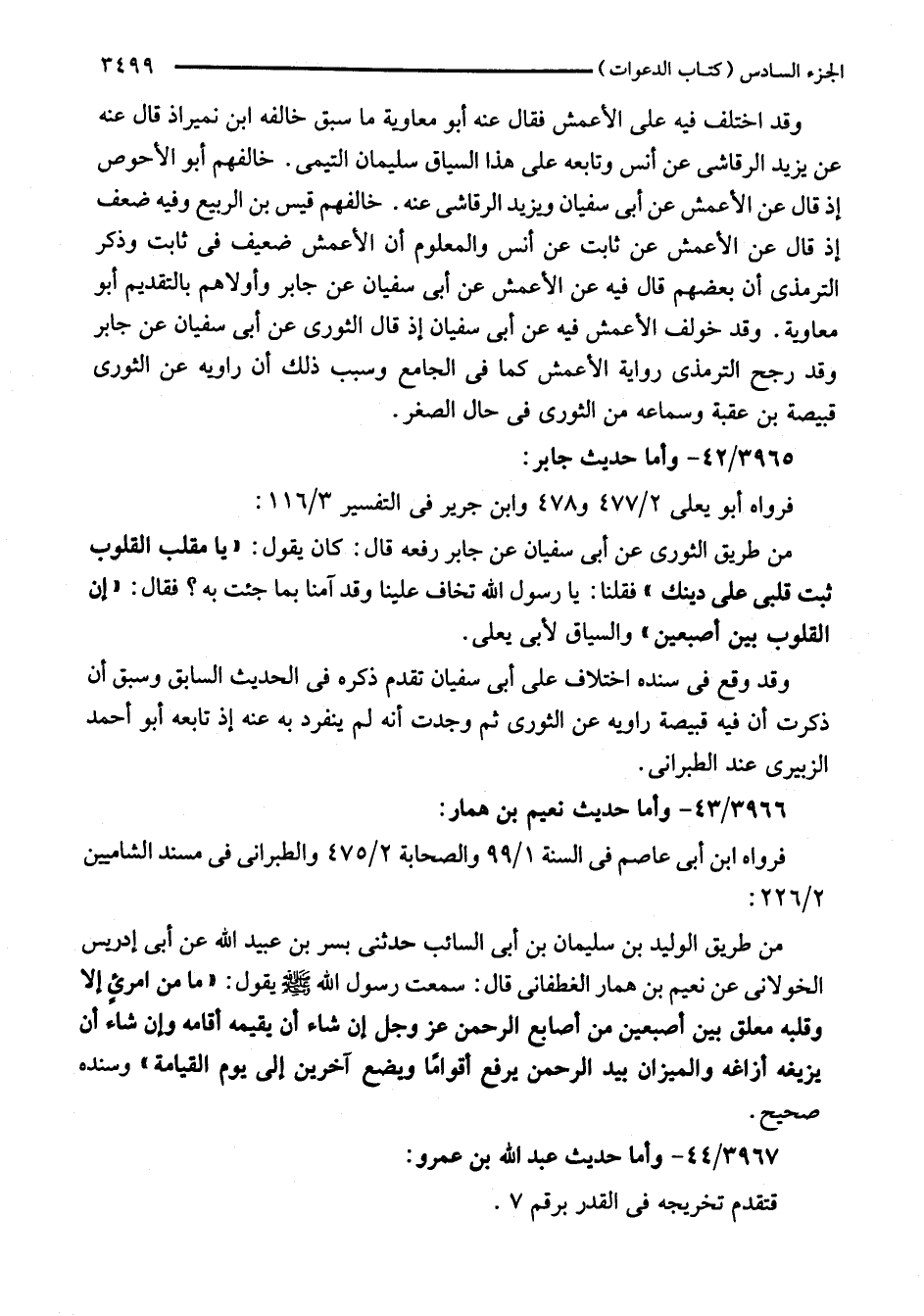 من طريق الثَّوريّ عن أبي سفيان عن جابر رفعه قال: كان يقول: "يَا مقلب القلوب ثبت قلبي على دينك" فقلنا: يَا رسول الله تخاف علينا وقد آمنا بما جئت به؟ فقال: "إن القلوب بين أصبعين" والسياق لأبي يعلى.