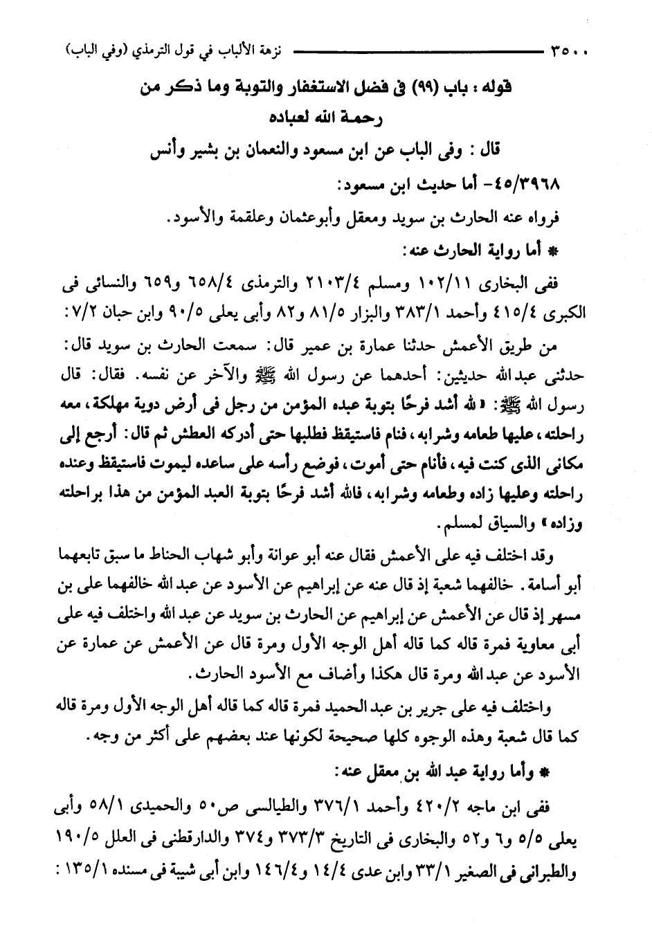 من طريق الأَعمش حَدَّثَنَا عمارة بن عمير قال: سمعت الحارث بن سويد قال: حَدَّثني عبد الله حديثين: أحدهما عن رسول الله - صلى الله عليه وسلم - والآخر عن نفسه. فقال: قال رسول الله - صلى الله عليه وسلم -: "لله أشد فرحًا بتوبة عبده المؤمن من رجل في أرض دوية مهلكة، معه راحلته، عليها طعامه وشرابه، فنام فاستيقظ فطلبها حتَّى أدركه العطش ثم قال: أرجع إلى مكانى الذى كنت فيه، فأنام حتَّى أموت، فوضع رأسه على ساعده ليموت فاستيقظ وعنده راحلته وعليها زاده وطعامه وشرابه، فالله أشد فرحًا بتوبة العبد المؤمن من هذا براحلته وزاده" والسياق لمسلم.