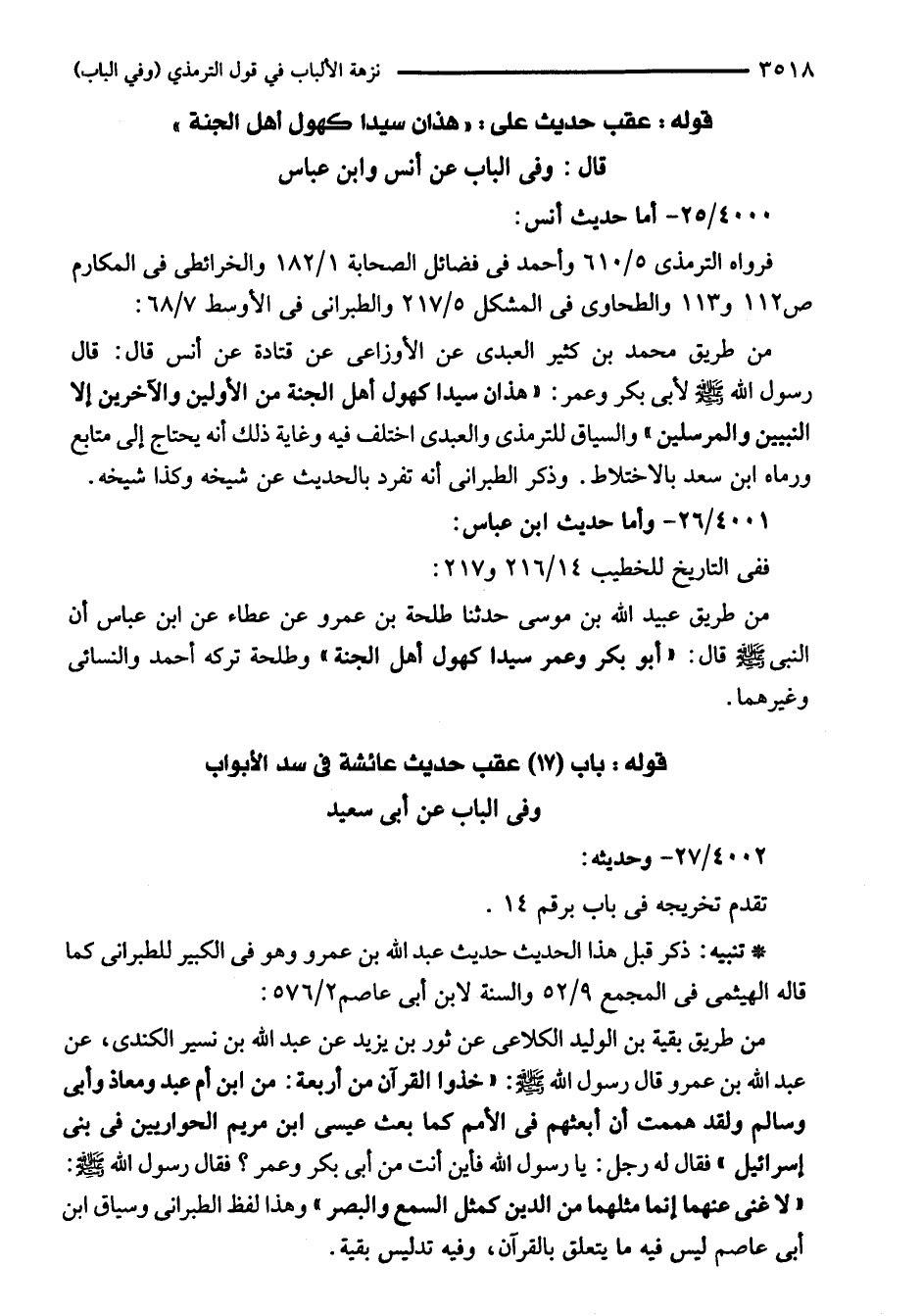 من طريق محمَّد بن كثير العبدي عن الأَوْزَاعِيّ عن قتادة عن أنس قال: قال رسول الله - صلى الله عليه وسلم - لأبي بكر وعمر: "هذان سيدا كهول أهل الجنة من الأولين والآخرين إلَّا النبيين والمرسلين" والسياق للترمذي والعبدى اختلف فيه وغاية ذلك أنَّه يحتاج إلى متابع ورماه ابن سعد بالاختلاط. وذكر الطَّبْرَانِيّ أنَّه تفرد بالحديث عن شيخه وكذا شيخه.