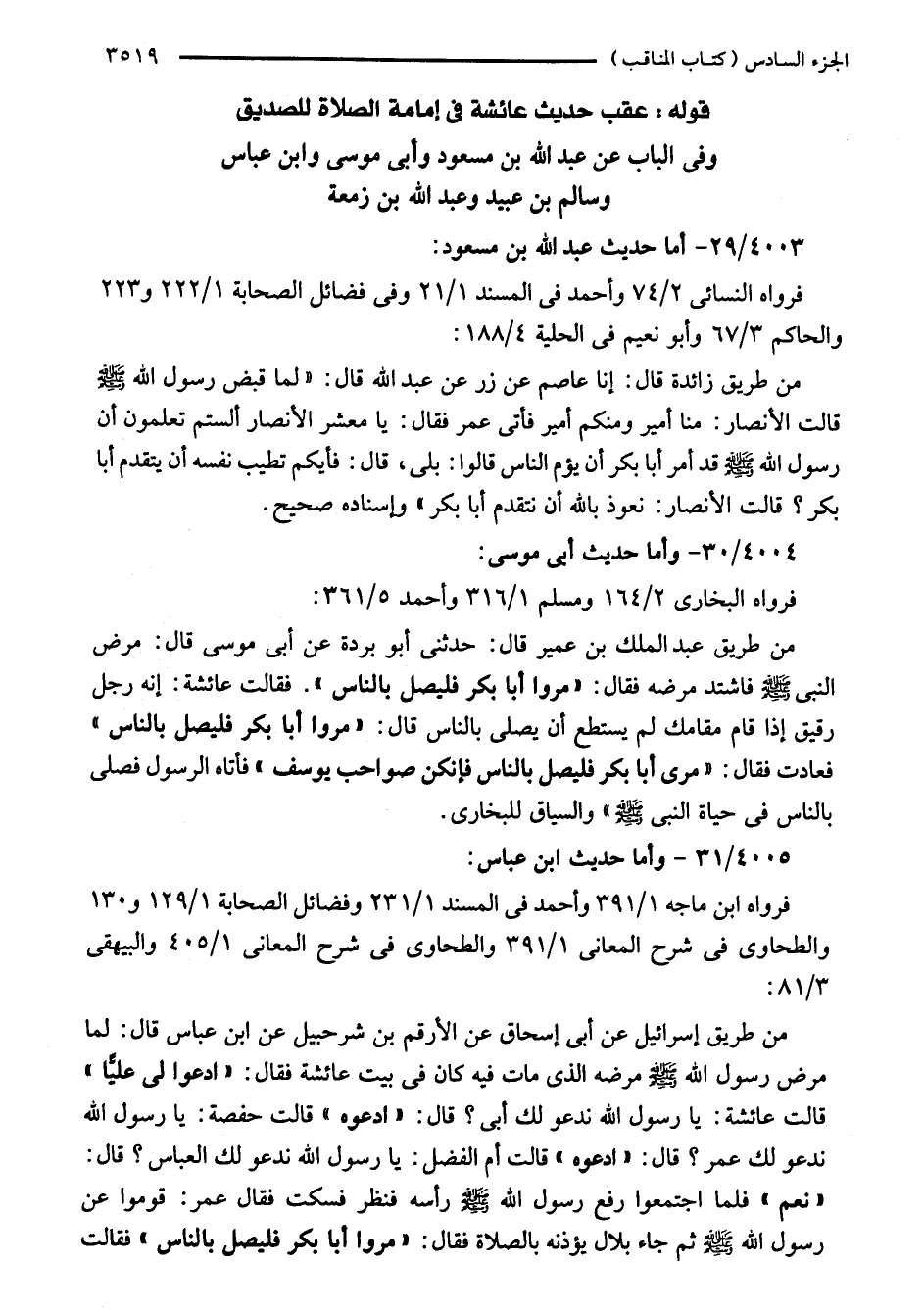 من طريق إسرائيل عن أبي إسحاق عن الأرقم بن شرحبيل عن ابن عباس قال: لما مرض رسول الله - صلى الله عليه وسلم - مرضه الذي مات فيه كان في بيت عائشة فقال: "ادعوا لي عليًّا" قالت عائشة: يَا رسول الله ندعو لك أبي؟ قال: "ادعوه" قالت حفصة: يَا رسول الله ندعو لك عمر؟ قال: "ادعوه" قالت أم الفضل: يَا رسول الله ندعو لك العباس؟ قال: "نعم" فلما اجتمعوا رفع رسول الله - صلى الله عليه وسلم - رأسه فنظر فسكت فقال عمر: قوموا عن رسول الله - صلى الله عليه وسلم - ثم جاء بلال يؤذنه بالصلاة فقال: "مروا أَبا بكر فليصل بالنَّاس" فقالت
