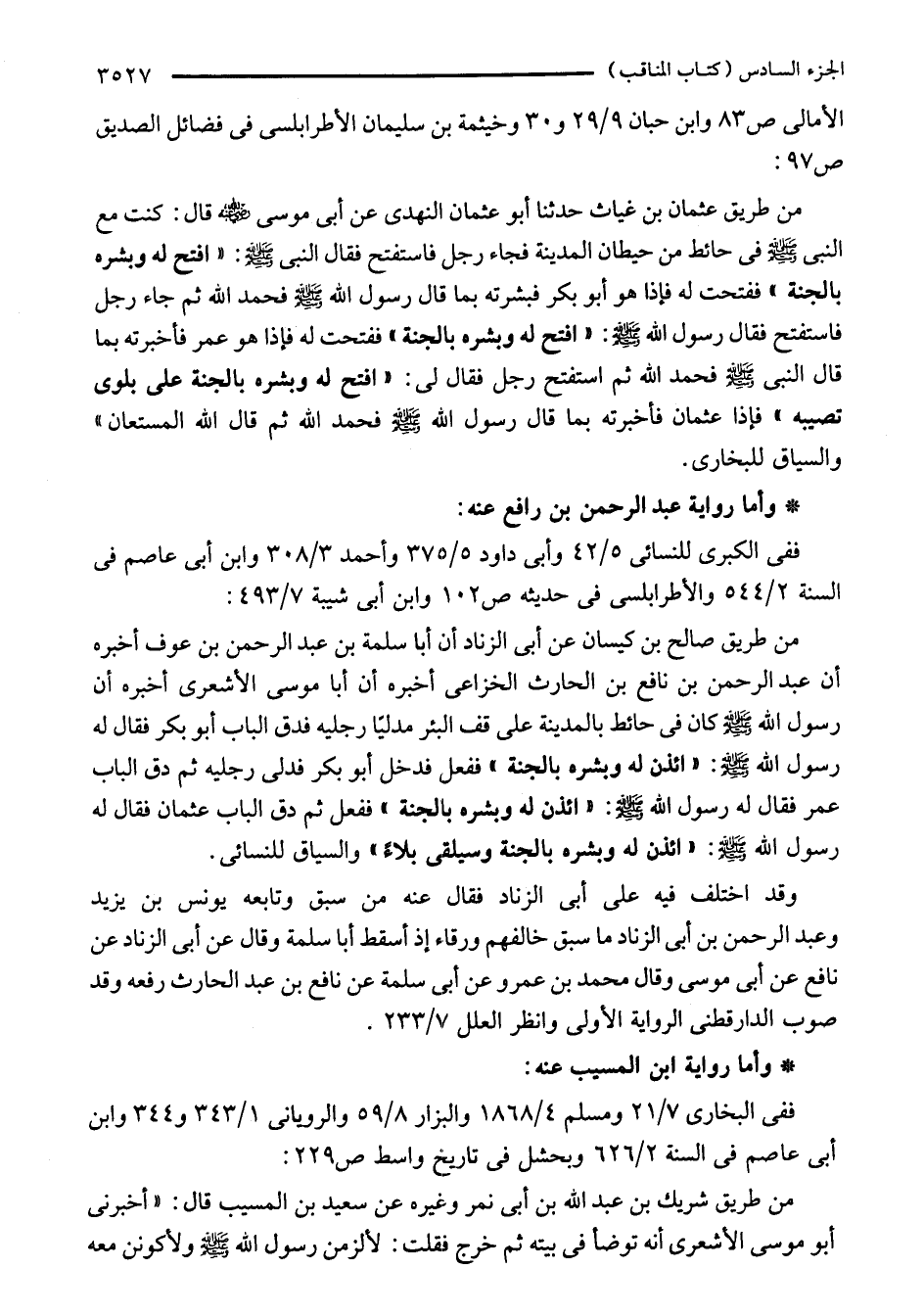 من طريق صالح بن كيسان عن أبي الزِّناد أن أَبا سلمة بن عبد الرَّحْمَن بن عوف أخبره أن عبد الرَّحْمَن بن نافع بن الحارث الخُزَاعِيّ أخبره أن أَبا موسى الأَشْعريّ أخبره أن رسول الله - صلى الله عليه وسلم - كان في حائط بالمدينة على قف البئر مدليًا رجليه فدق الباب أبو بكر فقال له رسول الله - صلى الله عليه وسلم -: "ائذن له وبشره بالجنة" ففعل فدخل أبو بكر فدلى رجليه ثم دق الباب عمر فقال له رسول الله - صلى الله عليه وسلم -: "ائذن له وبشره بالجنة" ففعل ثم دق الباب عثمان فقال له رسول الله - صلى الله عليه وسلم -: "ائذن له وبشره بالجنة وسيلقى بلاءً" والسياق للنسائي.
