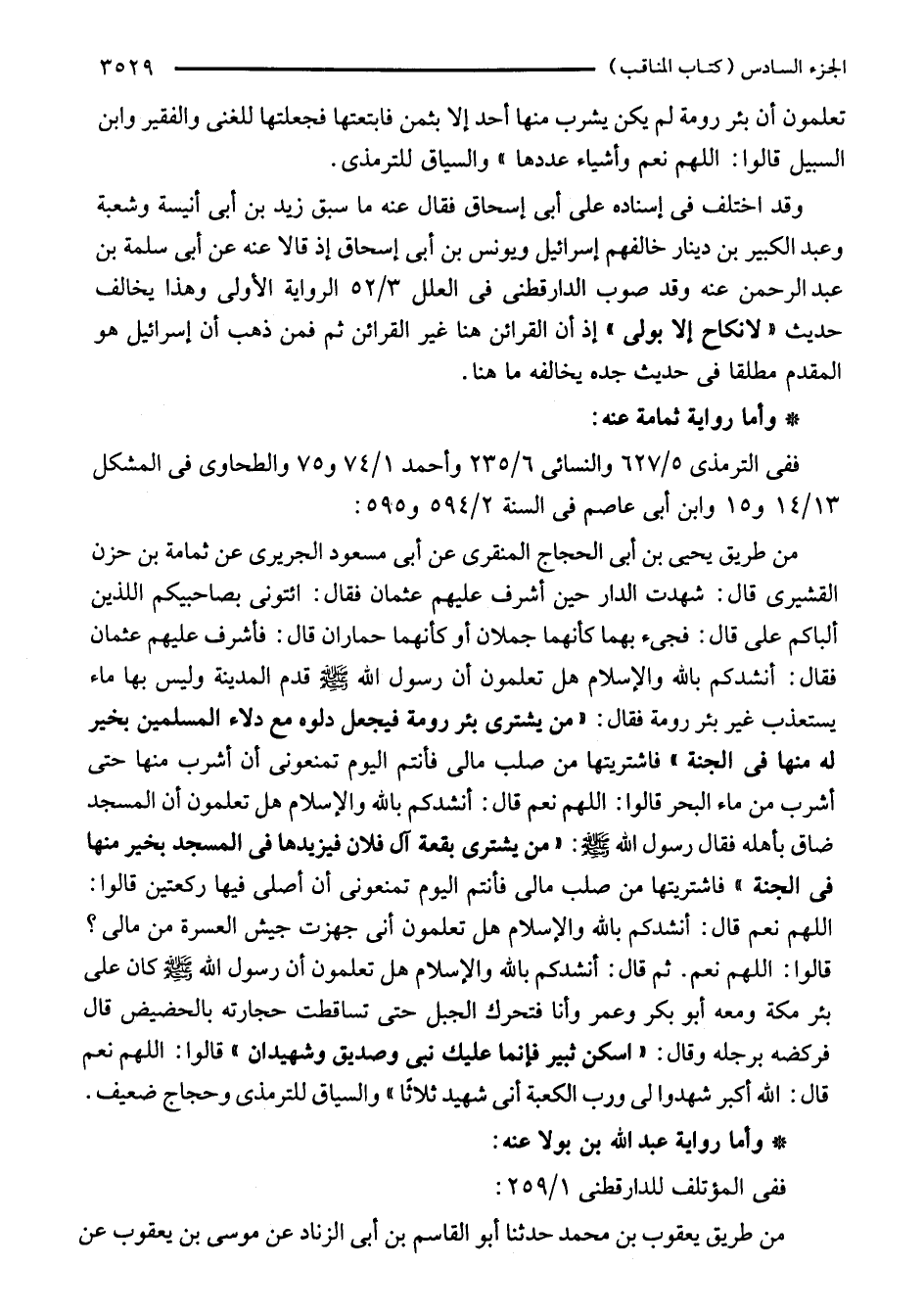 تعلمون أن بئر رومة لم يكن يشرب منها أحد إلَّا بثمن فابتعتها فجعلتها للغنى والفقير وابن السبيل قالوا: اللهمَّ نعم وأشياء عددها" والسياق للترمذي.