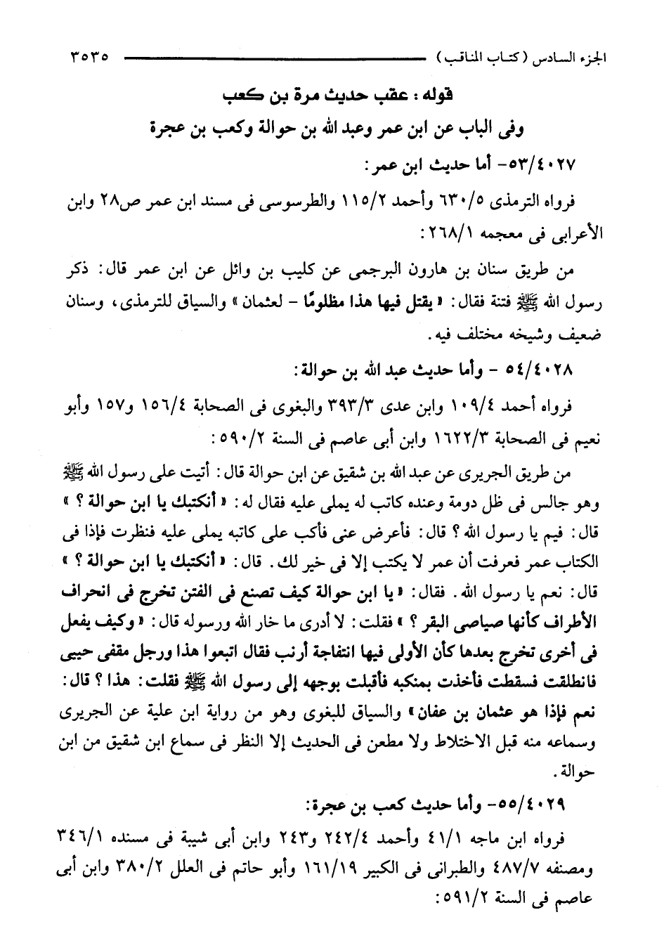 من طريق الجريري عن عبد الله بن شَقِيق عن ابن حوالة قال: أتيت على رسول الله - صلى الله عليه وسلم - وهو جالس في ظل دومة وعنده كاتب له يملى عليه فقال له: "أنكتبك يَا ابن حوالة؟ " قال: فيم يَا رسول الله؟ قال: فأعرض عني فاكب على كاتبه يملى عليه فنظرت فإذا في الكتاب عمر فعرفت أن عمر لا يكتب إلَّا في خير لك. قال: "أنكتبك يَا ابن حوالة؟ " قال: نعم يَا رسول الله. فقال: "يَا ابن حوالة كيف تصنع في الفتن تخرج في انحراف الأطراف كأنها صياصى البقر؟ " فقلت: لا أدري ما خار الله ورسوله قال: "وكيف يفعل في أخرى تخرج بعدها كأن الأولى فيها انتفاجة أرنب فقال اتبعوا هذا ورجل مقفى حييى فانطلقت فسقطت فأخذت بمنكبه فأقبلت بوجهه إلى رسول الله - صلى الله عليه وسلم - فقلت: هذا؟ قال: نعم فإذا هو عثمان بن عفان" والسياق للبغوى وهو من رواية ابن عليّة عن الجريري وسماعه منه قبل الاختلاط ولا مطعن في الحديث إلَّا النظر في سماع ابن شَقِيق من ابن حوالة.