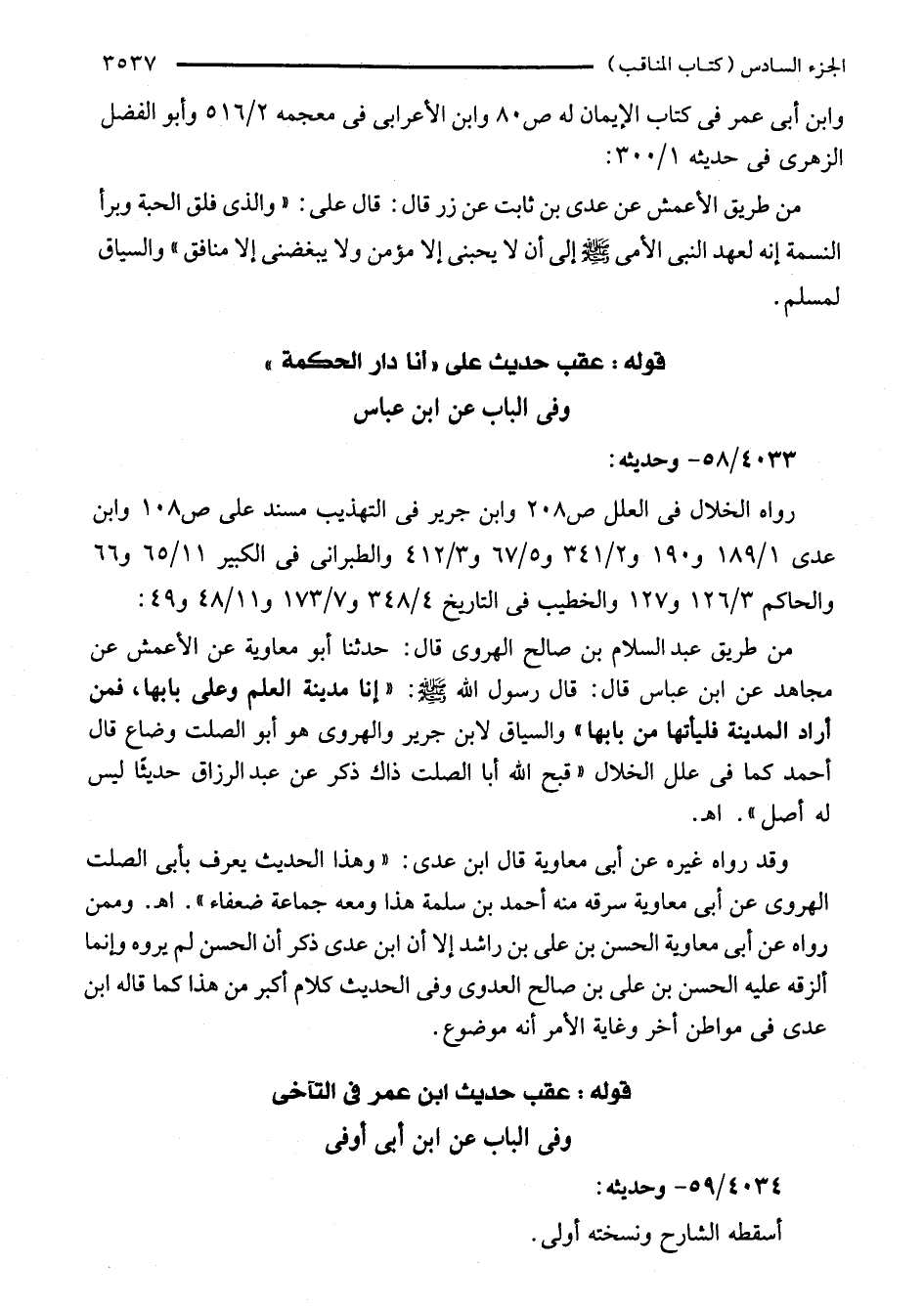 من طريق عبد السلام بن صالح الهروي قال: حَدَّثَنَا أبو معاوية عن الأَعمش عن مجاهد عن ابن عباس قال: قال رسول الله - صلى الله عليه وسلم -: "إنا مدينة العلم وعلى بابها، فمن أراد المدينة فليأتها من بابها" والسياق لابن جرير والهروى هو أبو الصلت وضاع قال أَحْمد كما في علل الخلال "قبح الله أَبا الصلت ذاك ذكر عن عبد الرَّزّاق حديثًا ليس له أصل". اهـ.