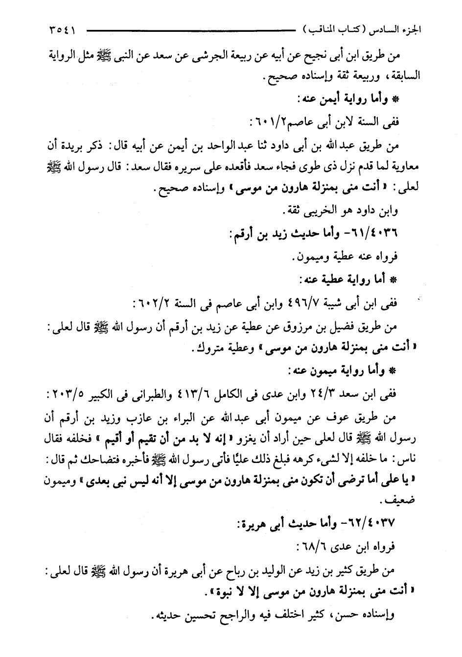 من طريق فضيل بن مرزوق عن عطية عن زيد بن أرقم أن رسول الله - صلى الله عليه وسلم - قال لعلى: "أَنْتَ مني بمنزلة هارون من موسى" وعطية متروك.