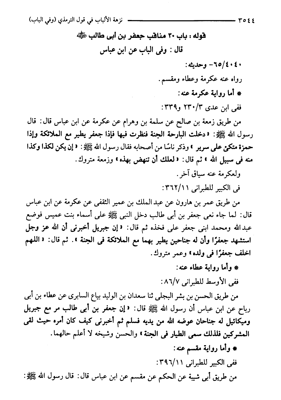 من طريق عمر بن هارون عن عبد الملك بن عمير الثَّقَفيّ عن عكرمة عن ابن عباس قال: لما جاء نعى جعفر بن أبي طالب دخل النَّبِيّ - صلى الله عليه وسلم - على أسماء بنت عميس فوضع عبد الله ومحمَّد ابني جعفر على فخذه ثم قال: "إن جبريل أخبرني أن الله عَزَّ وَجَلَّ استشهد جعفرًا وأن له جناحين يطير بهما مع الملائكة في الجنة". ثم قال: "اللهمَّ اخلف جعفرًا في ولده" وعمر متروك.