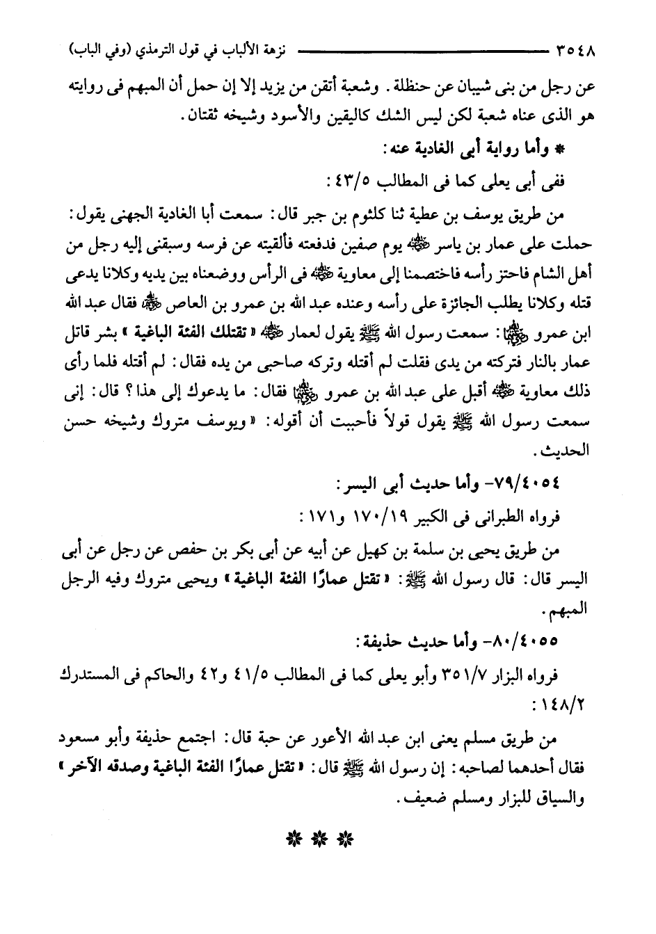 من طريق مسلم يعنى ابن عبد الله الأعور عن حبة قال: اجتمع حذيفة وأبو مسعود فقال أحدهما لصاحبه: إن رسول الله - صلى الله عليه وسلم - قال: "تقتل عمارًا الفئة الباغية وصدقه الآخر" والسياق للبزار ومسلم ضعيف.