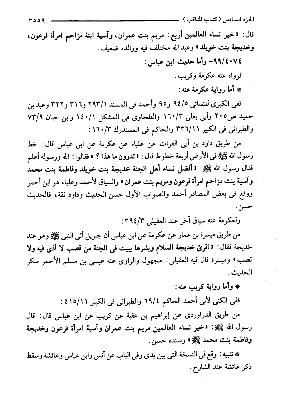 من طريق الدراوردى عن إبراهيم بن عقبة عن كريب عن ابن عبّاس قال: قال رسول الله - صلى الله عليه وسلم -: "خير نساء العالمين مريم بنت عمران وآسية امرأة فرعون وخديجة وفاطمة بنت محمّد - صلى الله عليه وسلم -" سنده حسن.
