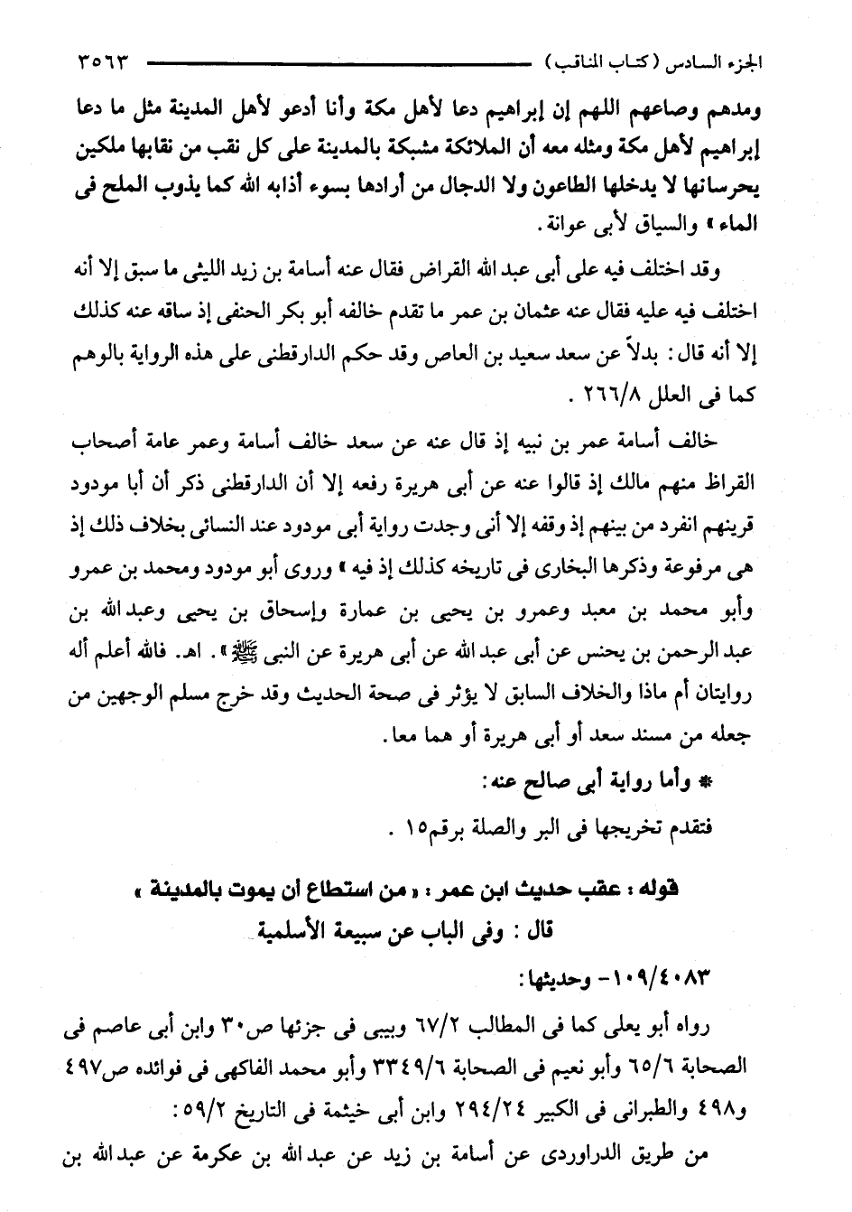 خالف أُسامة عمر بن نبيه إذ قال عنه عن سعد خالف أُسامة وعمر عامة أصحاب القراظ منهم مالك إذ قالوا عنه عن أبى هريرة رفعه إِلَّا أن الدارقطني ذكر أن أبا مودود قرينهم انفرد من بينهم إذ وقفه إِلَّا أنى وجدت رواية أبى مودود عند النَّسائيُّ بخلاف ذلك إذ هي مرفوعة وذكرها البخاريّ في تاريخه كذلك إذ فيه" وروى أبو مودود ومحمد بن عمرو وأبو محمّد بن معبد وعمرو بن يحيى بن عمارة واسحاق بن يحيى وعبد الله بن عبد الرّحمن بن يحيى عن أبى عبد الله عن أبى هريرة عن النَّبىِّ - صلى الله عليه وسلم -". اهـ. فالله أعلم أله روايتان أم ماذا والخلاف السابق لا يؤثر في صحة الحديث وقد خرج مسلم الوجهين من جعله من مسند سعد أو أبى هريرة أو هما معا.