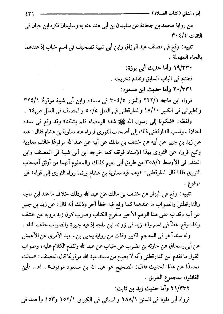 ولفظه: "شكونا إلى رسول الله - صلى الله عليه وسلم - شدة الرمضاء فلم يشكنا" وقد وقع في سنده اختلاف ونسب الدارقطني ذلك إلى أصحاب الثورى فرواه عنه معاوية بن هشام فقال: عنه عن زيد بن جبير عن أبيه عن خشف بن مالك عن أبيه عن عبد الله مرفوعًا خالف معاوية وكيع فرواه عن الثورى بهذا الإسناد فوقفه كما خرجه ابن أبى شيبة في المصنف وابن المنذر في الأوسط 2/ 358 من طريق أبى نعيم كذلك والمعلوم أنهما من أوثق أصحاب الثورى فلذا قال الدارقطني: "وهم فيه معاوية بن هشام وإنما رواه الثورى إلى قوله" غير مرفوع.