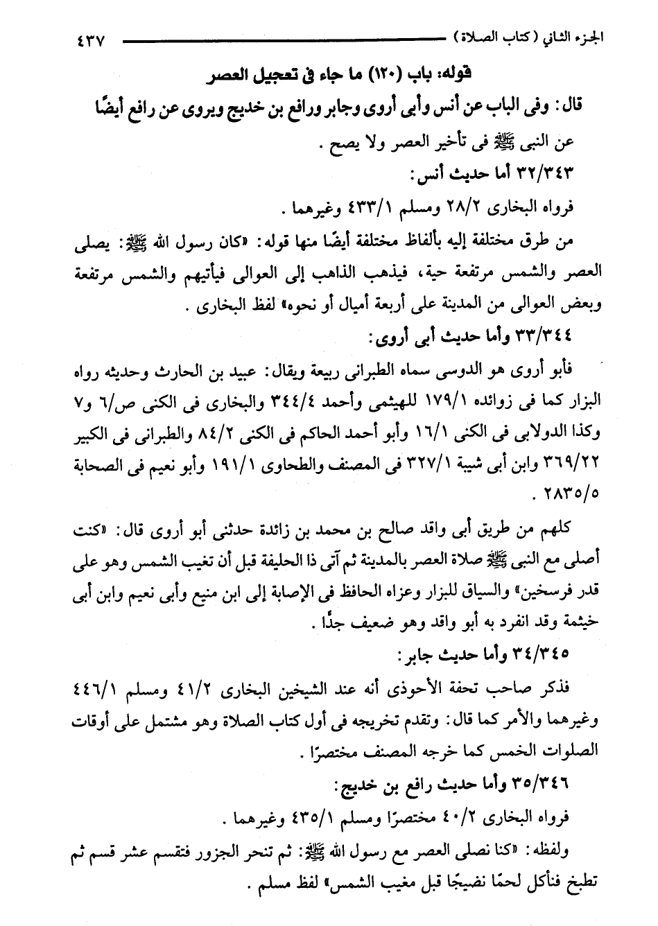 من طرق مختلفة إليه بألفاظ مختلفة أيضًا منها قوله: "كان رسول الله - صلى الله عليه وسلم -: يصلى العصر والشمس مرتفعة حية، فيذهب الذاهب إلى العوالى فيأتيهم والشمس مرتفعة وبعض العوالى من المدينة على أربعة أميال أو نحوه" لفظ البخاري.