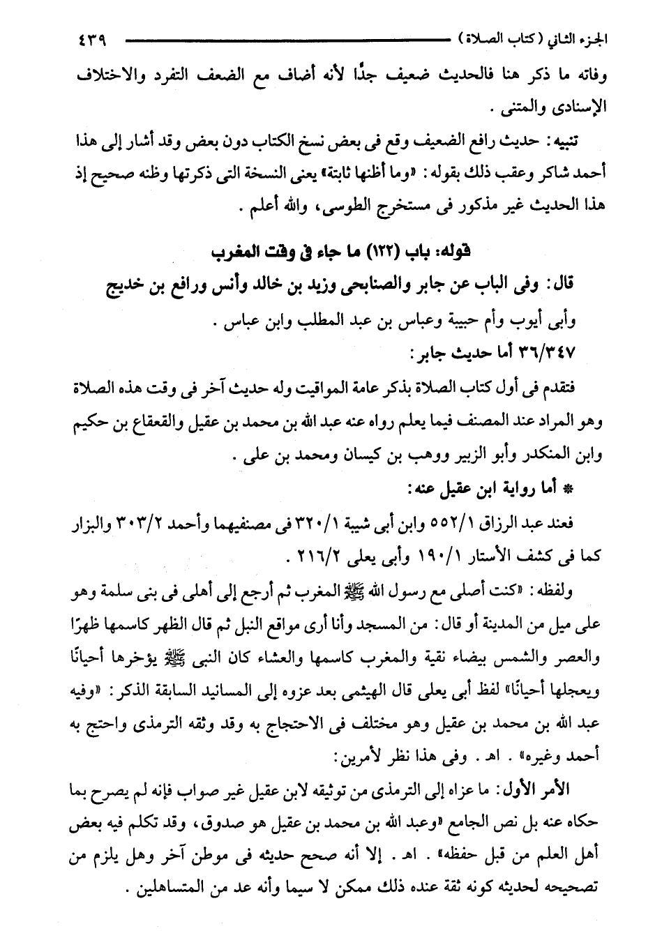 ولفظه: "كنت أصلى مع رسول الله - صلى الله عليه وسلم - المغرب ثم أرجع إلى أهلى في بنى سلمة وهو على ميل من المدينة أو قال: من المسجد وأنا أرى مواقع النبل ثم قال الظهر كاسمها ظهرًا والعصر والشمس بيضاء نقية والمغرب كاسمها والعشاء كان النبي - صلى الله عليه وسلم - يؤخرها أحيانًا ويعجلها أحيانًا" لفظ أبى يعلى قال الهيثمى بعد عزوه إلى المسانيد السابقة الذكر: "وفيه عبد الله بن محمد بن عقيل وهو مختلف في الاحتجاج به وقد وثقه الترمذي واحتج به أحمد وغيره". اهـ. وفى هذا نظر لأمرين: