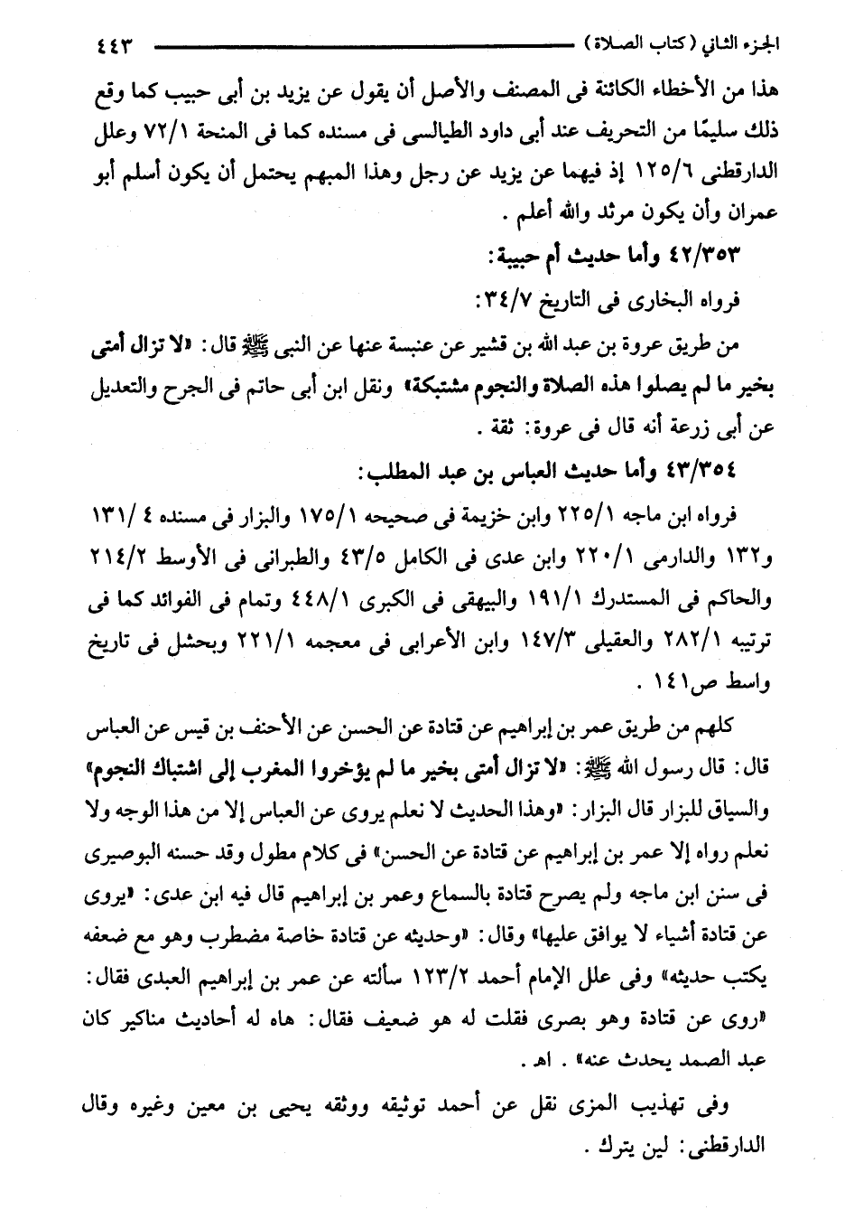 كلهم من طريق عمر بن إبراهيم عن قتادة عن الحسن عن الأحنف بن قيس عن العباس قال: قال رسول الله - صلى الله عليه وسلم -: "لا تزال أمتى بخير ما لم يؤخروا المغرب الى اشتباك النجوم" والسياق للبزار قال البزار: "وهذا الحديث لا نعلم يروى عن العباس إلا من هذا الوجه ولا نعلم رواه إلا عمر بن إبراهيم عن قتادة عن الحسن" في كلام مطول وقد حسنه البوصيرى في سنن ابن ماجه ولم يصرح قتادة بالسماع وعمر بن إبراهيم قال فيه ابن عدى: "يروى عن قتادة أشياء لا يوافق عليها" وقال: "وحديثه عن قتادة خاصة مضطرب وهو مع ضعفه يكتب حديثه" وفى علل الإمام أحمد 2/ 123 سألته عن عمر بن إبراهيم العبدى فقال: "روى عن قتادة وهو بصرى فقلت له هو ضعيف فقال: هاه له أحاديث مناكير كان عبد الصمد يحدث عنه". اهـ.