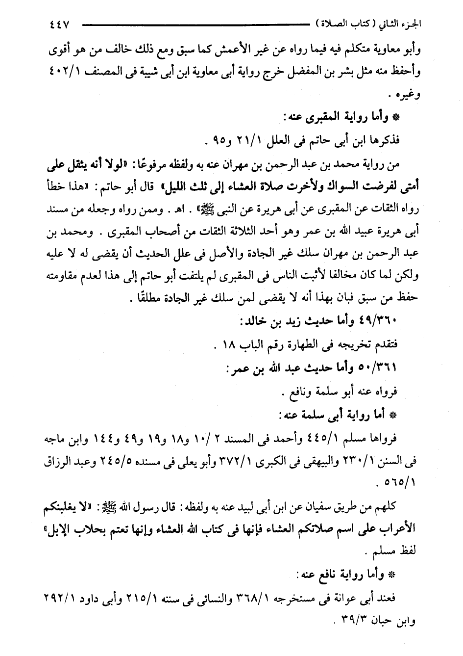من رواية محمد بن عبد الرحمن بن مهران عنه به ولفظه مرفوعًا: "لولا أنه يثقل على أمتى لفرضت السواك ولأخرت صلاة العشاء إلى ثلث الليل" قال أبو حاتم: "هذا خطأ رواه الثقات عن المقبرى عن أبى هريرة عن النبي - صلى الله عليه وسلم -". اهـ. وممن رواه وجعله من مسند أبى هريرة عبيد الله بن عمر وهو أحد الثلاثة الثقات من أصحاب المقبرى. ومحمد بن عبد الرحمن بن مهران سلك غير الجادة والأصل في علل الحديث أن يقضى له لا عليه ولكن لما كان مخالفا لأثبت الناس في المقبرى لم يلتفت أبو حاتم إلى هذا لعدم مقاومته حفظ من سبق فبان بهذا أنه لا يقضى لمن سلك غير الجادة مطلقًا.
