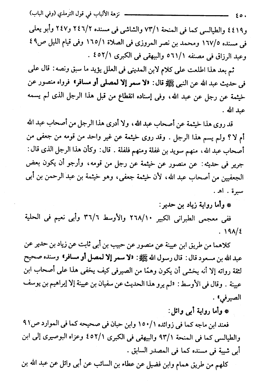 كلاهما من طريق ابن عيينة عن منصور عن حبيب بن أبى ثابت عن زياد بن حدير عن عبد الله بن مسعود قال: قال رسول الله - صلى الله عليه وسلم -: "لا سمر إلا لمصل أو مسافر" وسنده صحيح لثقة رواته إلا أنه يخشى أن يكون وهمًا من الصيرفى كيف يخفى هذا على أصحاب ابن عيينة. وقال في الأوسط: "لم يرو هذا الحديث عن سفيان بن عيينة إلا إبراهيم بن يوسف الصيرفي".