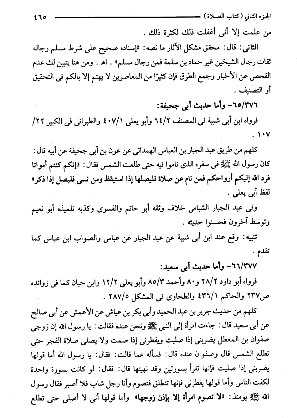 الثانى: قال: محقق مشكلى الآثار ما نصه: "إسناده صحيح على شرط مسلم رجاله ثقات رجال الشيخين غير حماد بن سلمة فمن رجال مسلم". اهـ. ومن هنا يتبين لك عدم الفحص عن الأخبار وجمع الطرق فإن كثيرًا من المعاصرين لا يهتم إلا بالكم في التحقيق أو التصنيف.