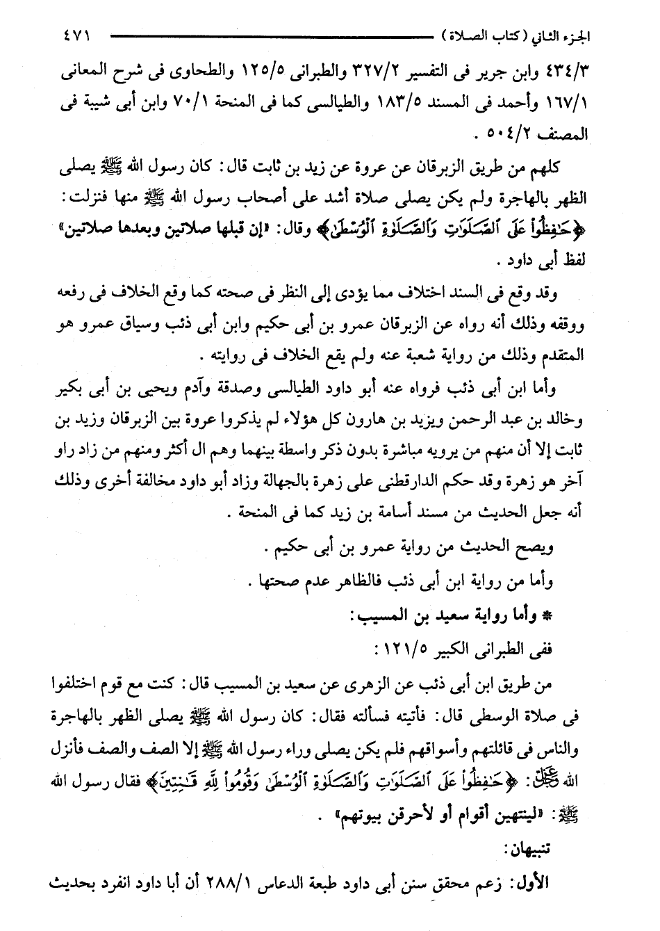 كلهم من طريق الزبرقان عن عروة عن زيد بن ثابت قال: كان رسول الله - صلى الله عليه وسلم - يصلى الظهر بالهاجرة ولم يكن يصلى صلاة أشد على أصحاب رسول الله - صلى الله عليه وسلم - منها فنزلت: {حَافِظُوا عَلَى الصَّلَوَاتِ وَالصَّلَاةِ الْوُسْطَى} وقال: "إن قبلها صلاتين وبعدها صلاتين" لفظ أبى داود.
