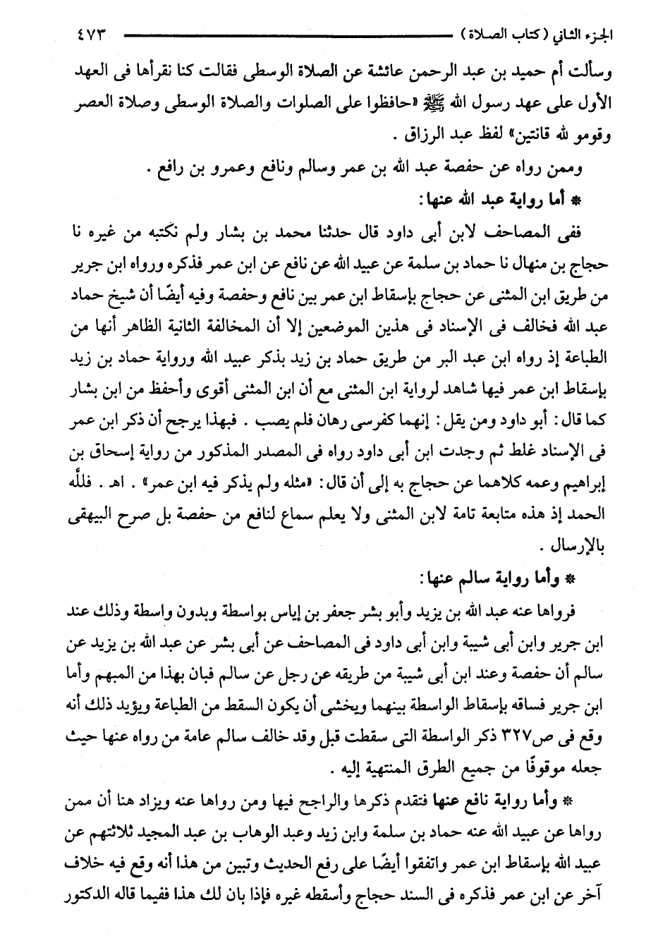 فرواها عنه عبد الله بن يزيد وأبو بشر جعفر بن إياس بواسطة وبدون واسطة وذلك عند ابن جرير وابن أبى شيبة وابن أبى داود في المصاحف عن أبى بشر عن عبد الله بن يزيد عن سالم أن حفصة وعند ابن أبى شيبة من طريقه عن رجل عن سالم فبان بهذا من المبهم وأما ابن جرير فساقه بإسقاط الواسطة بينهما ويخشى أن يكون السقط من الطباعة ويؤيد ذلك أنه وقع في ص 327 ذكر الواسطة التى سقطت قبل وقد خالف سالم عامة من رواه عنها حيث جعله موقوفًا من جميع الطرق المنتهية إليه.
