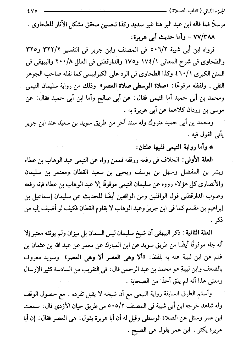 وأسلم الطرق السابقة رواية التيمى مع أن شيخه لا يقبل تفرده. مع حصول الوقف وله شاهد خرجه ابن أبى شيبة في المصنف 2/ 505 من طريق حيان الأزدى قال: سمعت ابن عمر وسئل عن الصلاة الوسطى وقيل له أن أبا هريرة يقول: هي العصر فقال: إن أبا هريرة يكثر. ابن عمر يقول هي الصبح.