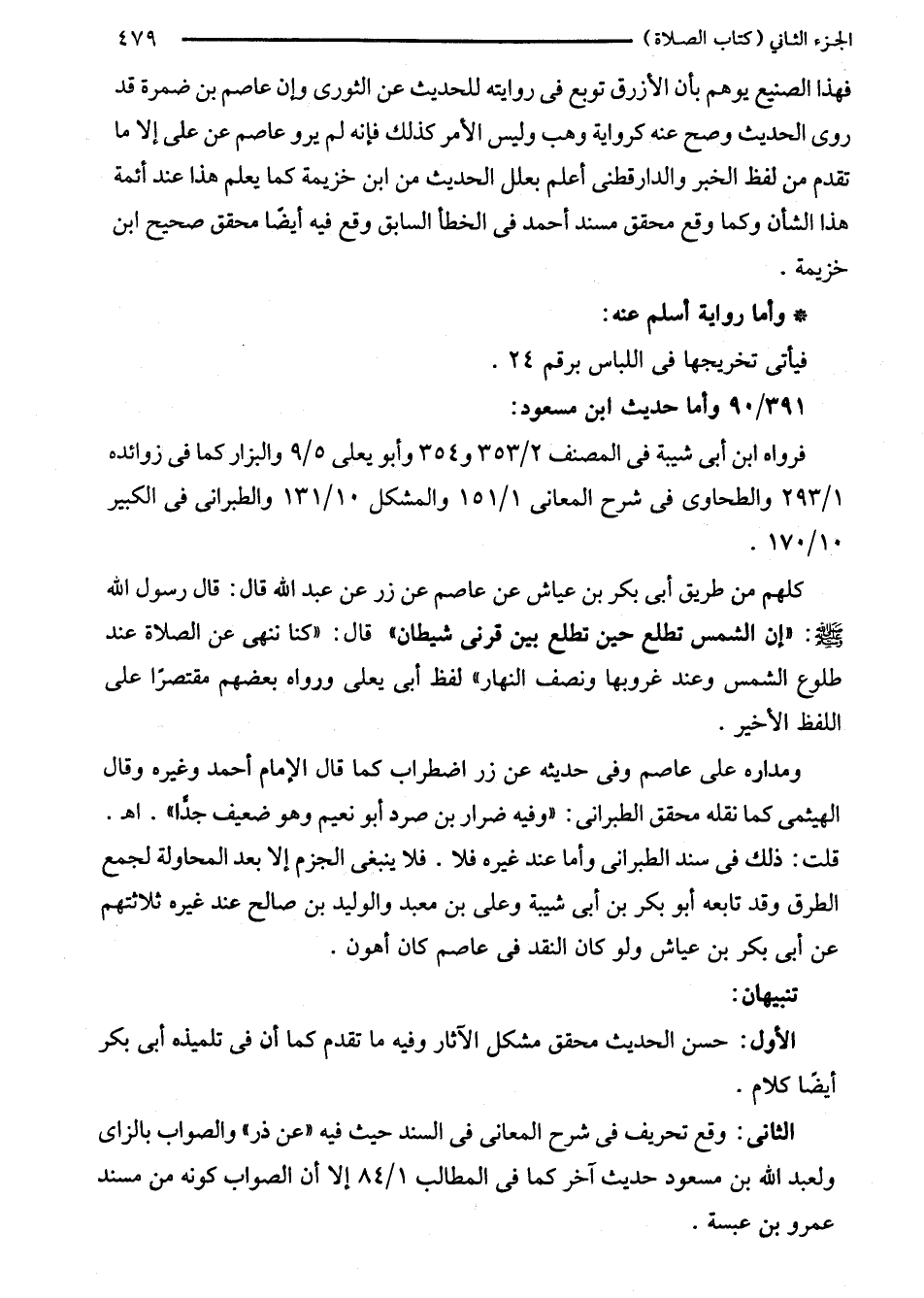 كلهم من طريق أبى بكر بن عياش عن عاصم عن زر عن عبد الله قال: قال رسول الله - صلى الله عليه وسلم -: "إن الشمس تطلع حين تطلع بين قرنى شيطان" قال: "كنا ننهى عن الصلاة عند طلوع الشمس وعند غروبها ونصف النهار" لفظ أبى يعلى ورواه بعضهم مقتصرًا على اللفظ الأخير.