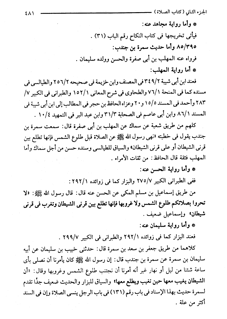 كلهم من طريق شعبة عن سماك عن المهلب بن أبى صفرة قال: سمعت سمرة بن جندب يقول في خطبته "نهى رسول الله - صلى الله عليه وسلم - عن الصلاة قبل طلوع الشمس فإنها تطلع بين قرنى الشيطان أو على قرنى الشيطان" والسياق للطيالسى وسنده حسن من أجل سماك وأما المهلب فثقة قال الحافظ: من ثقات الأمراء.