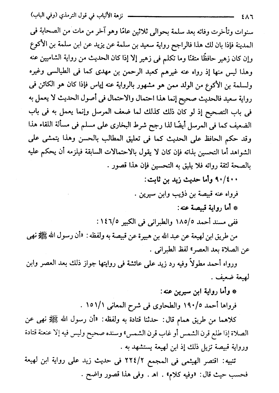 سنوات وتأخرت وفاته بعد سلمة بحوالى ثلاثين عامًا وهو آخر من مات من الصحابة في المدينة فإذا بأن لك هذا فالراجح رواية سعيد بن سلمة عن يزيد عن ابن سلمة بن الأكوع وإن كان زهير حافطًا متقنًا وما تكلم في زهير إلا إذا كان الحديث من رواية الشاميين عنه وهذا ليس منها إذ رواه عنه غيرهم كعبد الرحمن بن مهدى كما في الطيالسى وغيره ولسلمة بن الأكوع من الولد ممن هو مشهور بالرواية عنه الاس فإذا كان هو الكائن في رواية سعيد فالحديث صحيح إنما هذا احتمال والاحتمال في أصول الحديث لا يعمل به في باب التصحيح إذ لو كان ذلك كذلك لما ضعف المرسل وإنما يعمل به في باب الضعيف كما في المرسل أيضًا لذا رجح شرط البخاري على مسلم في مسألة اللقاء هذا وقد حكم الحافظ على الحديث كما في تعليق المطالب بالحسن وهذا يتمشى على الشواهد أما التحسين بذاته فإن كان لا يقول بالاحتمالات السابقة فيلزمه أن يحكم عليه بالصحة لثقة رواته فلا يليق به التحسين فإن هذا قصور.