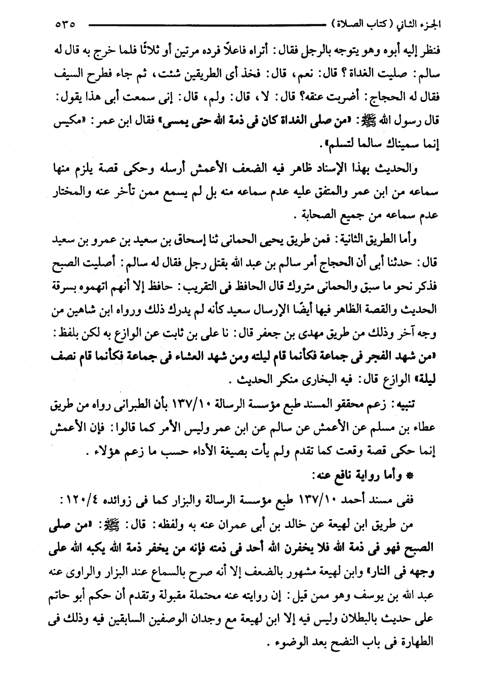 وأما الطريق الثانية: فمن طريق يحيى الحمانى ثنا إسحاق بن سعيد بن عمرو بن سعيد قال: حدثنا أبى أن الحجاج أمر سالم بن عبد الله بقتل رجل فقال له سالم: أصليت الصبح فذكر نحو ما سبق والحمانى متروك قال الحافظ في التقريب: حافظ إلا أنهم اتهموه بسرقة الحديث والقصة الظاهر فيها أيضًا الإرسال سعيد كأنه لم يدرك ذلك ورواه ابن شاهين من وجه آخر وذلك من طريق مهدى بن جعفر قال: نا على بن ثابت عن الوازع به لكن بلفظ: "من شهد الفجر في جماعة فكأنما قام ليلته ومن شهد العشاء في جماعة فكأنما قام نصف ليلة" الوازع قال: فيه البخاري منكر الحديث.
