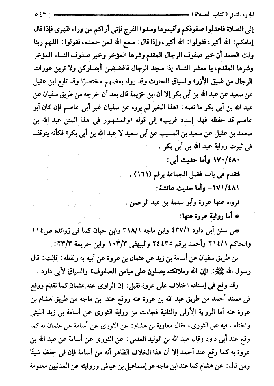 من طريق سفيان عن أسامة بن زيد عن عثمان بن عروة عن أبيه به ولفظه: قالت: قال رسول الله - صلى الله عليه وسلم -: "إن الله وملائكته يصلون على ميامن الصفوف" والسياق لأبي داود.