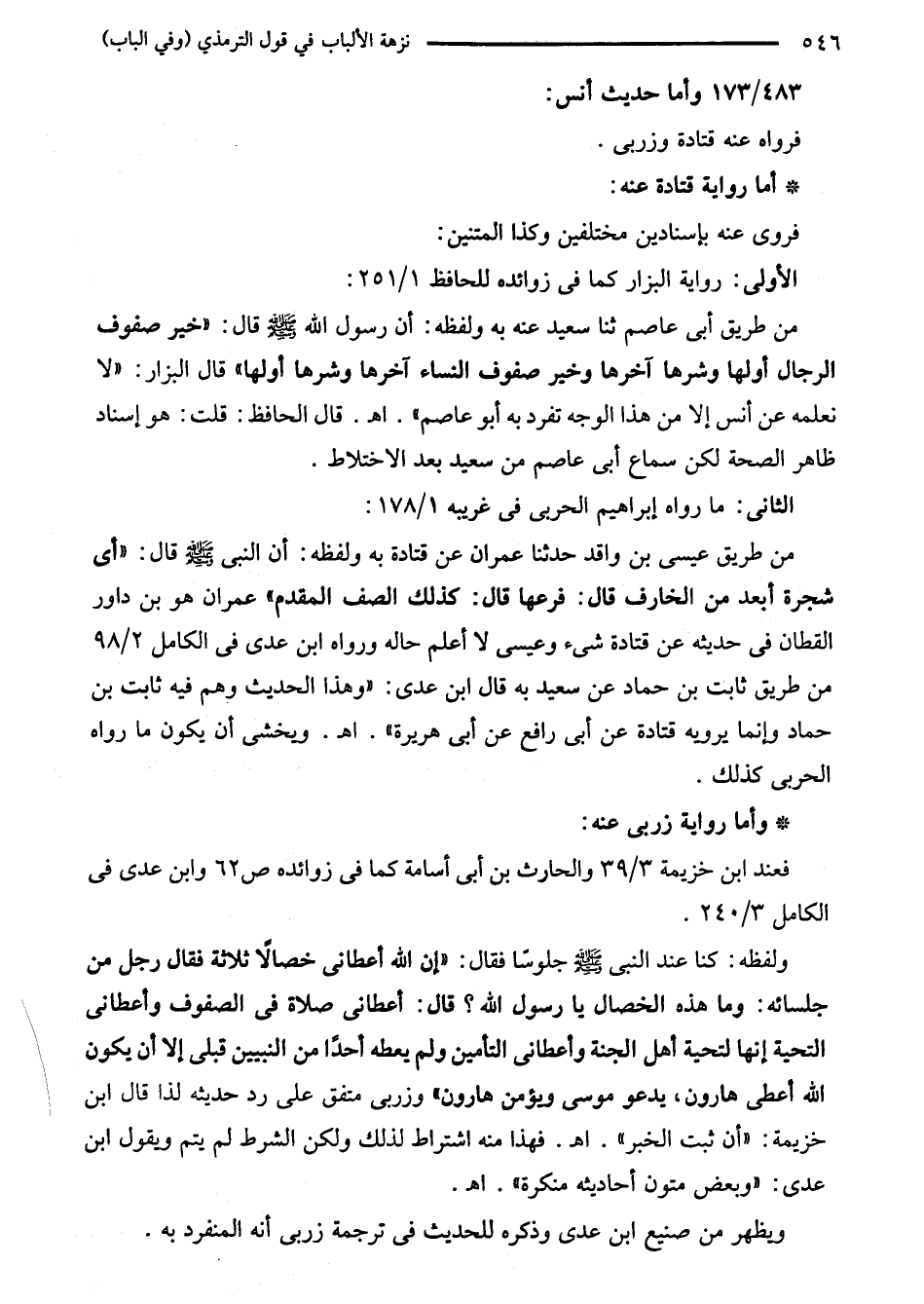 من طريق أبى عاصم ثنا سعيد عنه به ولفظه: أن رسول الله - صلى الله عليه وسلم - قال: "خير صفوف الرجال أولها وشرها آخرها وخير صفوت النساء آخرها وشرها أولها" قال البزار: "لا نعلمه عن أنس إلا من هذا الوجه تفرد به أبو عاصم". اهـ. قال الحافظ: قلت: هو إسناد ظاهر الصحة لكن سماع أبى عاصم من سعيد بعد الاختلاط.