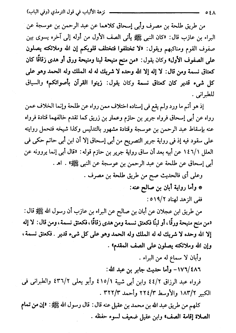من طريق طلحة بن مصرف وأبى إسحاق كلاهما عن عبد الرحمن بن عوسجة عن الباء بن عازب قال: "كان النبي - صلى الله عليه وسلم - يأتى آخره يسوى بين صفوف القوم ومناكبهم ويقول: "لا تختلفوا فتختلف قلوبكم إن الله وملائكته يصلون على الصفوف الأول" وكان يقول: "من منح منيحة لبنا ومنيحة ورق أو هدى زقاقًا كان كعتاق نسمة ومن قال: لا إله إلا الله وحده لا شريك له له الملك وله الحمد وهو على كل شىء قدير كان كعتاق نسمة وكان يقول: زينوا القرآن بأصواتكم" والسياق للطبراني.