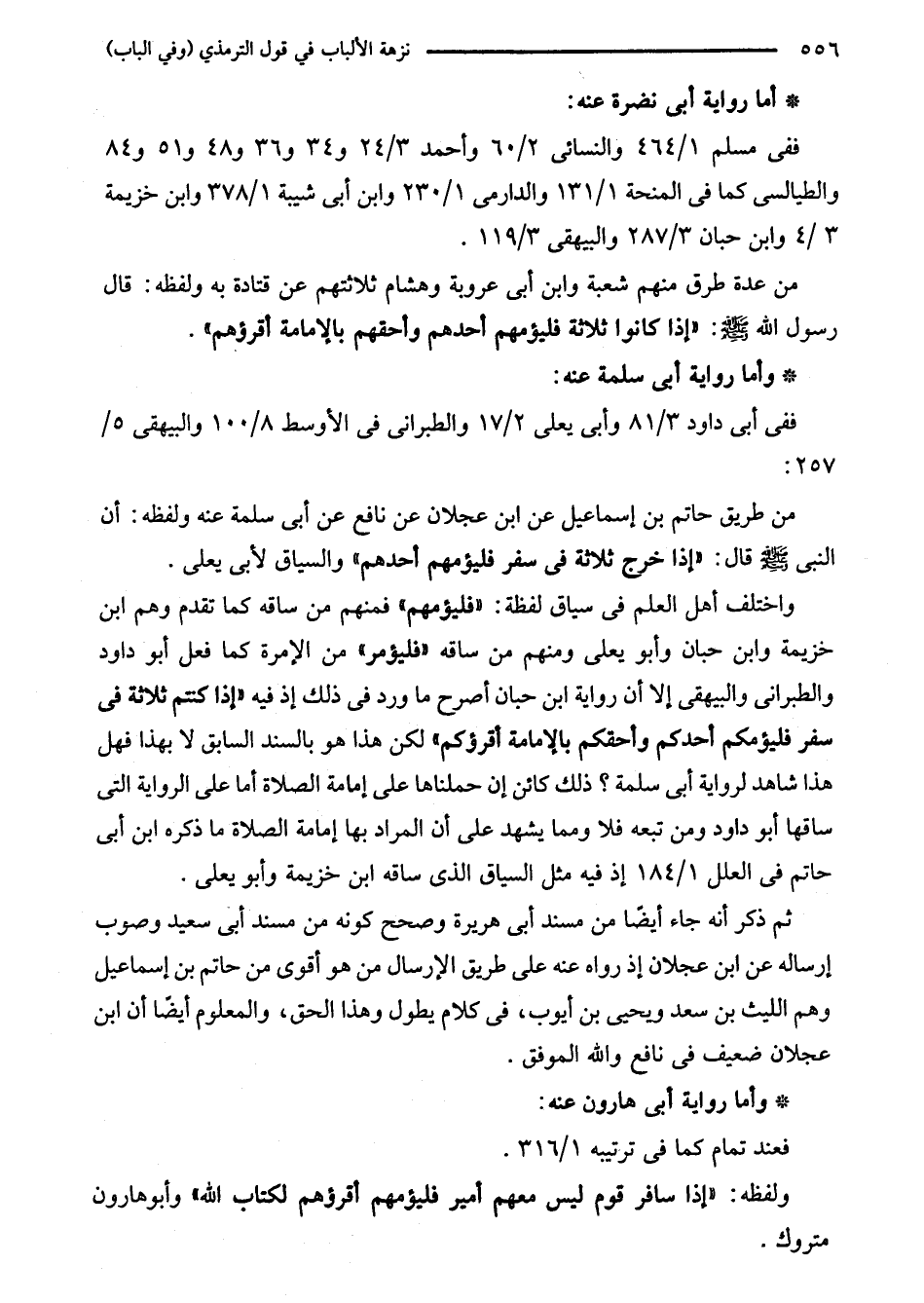سفر فليؤمكم أحدكم وأحقكم بالإمامة أقرؤكم" لكن هذا هو بالسند السابق لا بهذا فهل هذا شاهد لرواية أبى سلمة؟ ذلك كائن إن حملناها على إمامة الصلاة أما على الرواية التى ساقها أبو داود ومن تبعه فلا ومما يشهد على أن المراد بها إمامة الصلاة ما ذكره ابن أبى حاتم في العلل 1/ 184 إذ فيه مثل السياق الذى ساقه ابن خزيمة وأبو يعلى.