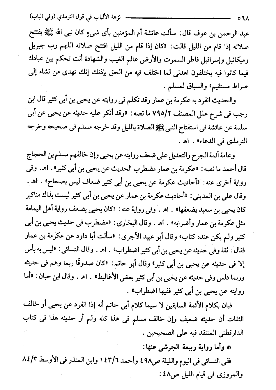 والحديث انفرد به عكرمة بن عمار وقد تكلم في روايته عن يحيى بن أبى كثير قال ابن رجب في شرح علل المصنف 2/ 795 ما نصه: "وقد أنكر عليه حديثه عن يحيى عن أبى سلمة عن عائشة في استفتاح النبي - صلى الله عليه وسلم - الصلاة بالليل وقد خرجه مسلم في صحيحه وخرجه الترمذي في الدعاء". اهـ.