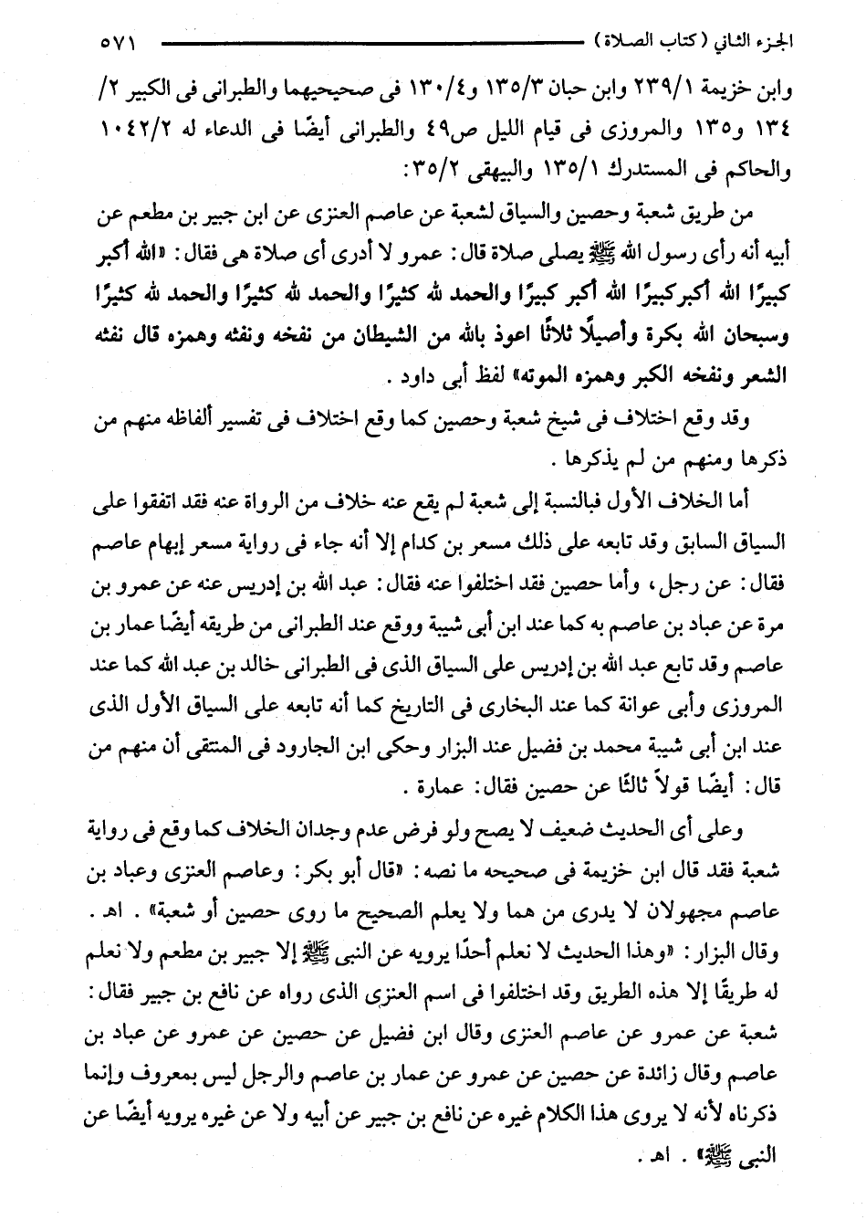 من طريق شعبة وحصين والسياق لشعبة عن عاصم العنزى عن ابن جبير بن مطعم عن أبيه أنه رأى رسول الله - صلى الله عليه وسلم - يصلى صلاة قال: عمرو لا أدرى أي صلاة هي فقال: "الله أكبر كبيرًا الله أكبر كبيرًا الله أكبر كبيرًا والحمد لله كثيرًا والحمد لله كثيرًا والحمد لله كثيرًا وسبحان الله بكرة وأصيلًا ثلاًثا أعوذ بالله من الشيطان من نفخه ونفثه وهمزه قال نفثه الشعر ونفخه الكبر وهمزه الموته" لفظ أبى داود.