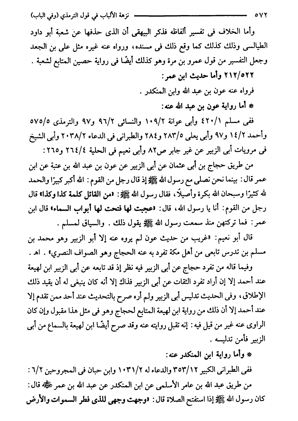 من طريق حجاج بن أبى عثمان عن أبى الزبير عن عون بن عبد الله بن عتبة عن ابن عمر قال: بينما نحن نصلى مع رسول الله - صلى الله عليه وسلم - إذ قال رجل من القوم: الله أكبر كبيرًا والحمد لله كثيرًا وسبحان الله بكرة وأصيلًا، فقال رسول الله - صلى الله عليه وسلم -: "من القائل كلمة كذا وكذا" قال رجل من القوم: أنا يا رسول الله، قال: "عجبت لها فتحت لها أبواب السماء" قال ابن عمر: فما تركتهن منذ سمعت رسول الله - صلى الله عليه وسلم - يقول ذلك. والسياق لمسلم.