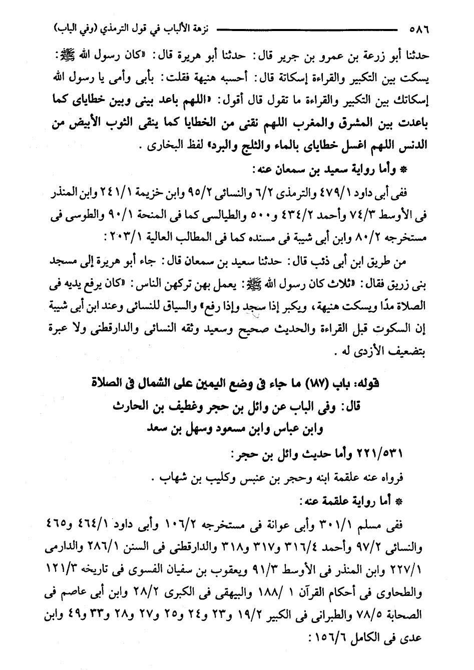 ففي أبى داود 1/ 479 والترمذي 2/ 6 والنسائي 2/ 95 وابن خزيمة 1/ 241 وابن المنذر في الأوسط 3/ 74 وأحمد 2/ 434 و 500 والطيالسى كما في المنحة 1/ 90 والطوسى في مستخرجه 2/ 80 وابن أبى شيبة في مسنده كما في المطالب العالية 1/ 203: