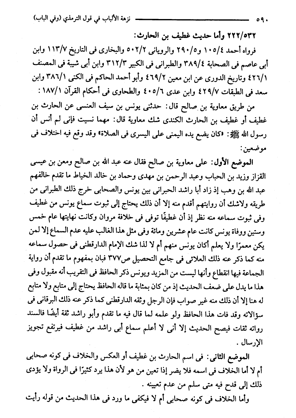 الموضع الأول: على معاوية بن صالح فقال عنه عبد الله بن صالح ومعن بن عيسى القزاز وزيد بن الحباب وعبد الرحمن بن مهدى وحماد بن خالد الخياط ما تقدم خالفهم عبد الله بن وهب إذ زاد أبا راشد الحبرانى بين يونس والصحابي خرج ذلك الطبراني من طريقه ولاشك أن روايتهم أقدم منه إلا أن ذلك يحتاج إلى ثبوت سماع يونس من غطيف وفى ثبوت سماعه منه نظر إذ أن غطيفًا توفى في خلافة مروان وكانت نهايتها عام خمس وستين ووفاة يونس كانت عام عشرين ومائة وفى مثل هذا الغالب عليه عدم السماع إلا لمن يكن معمرًا ولا يعلم أكان يونس منهم أم لا لذا شك الإمام الدارقطني في حصول سماعه منه كما ذكر عنه ذلك العلائى في جامع التحصيل ص 377 فبان بمفهوم ما تقدم أن رواية الجماعة فيها انقطاع وأنها ليست من المزيد ويونس ذكر الحافظ في التقريب أنه مقبول وفى هذا ما يدل على ضعف الحديث إذ من كان بمثابة ما قاله الحافظ يحتاج إلى متابع ولا متابع له هنا إلا أن ذلك منه غير صواب فإن الرجل وثقه الدارقطني كما ذكر عنه ذلك البرقانى في سؤالاته وقد فات هذا الحافظ ولو علمه لما قال فيه ما تقدم وأبو راشد ثقة أيضًا فالسند رواته ثقات فيصح الحديث إلا أنى لا أعلم سماع أبى راشد من غطيف فيرتفع تجويز الإرسال.