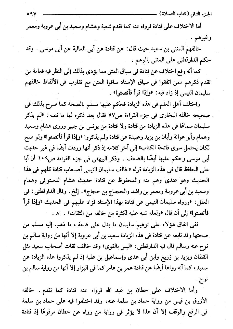كما أنه وقع اختلاف عن قتادة في سياق المتن مما يؤدى بذلك إلى النظر فيه فعامة من تقدم ذكرهم ممن اتفقوا في سياق الإسناد ساقوا المتن مع تقارب في الألفاظ خالفهم سليمان التيمى إذ زاد فيه: "وإذا قرأ فأنصتوا".