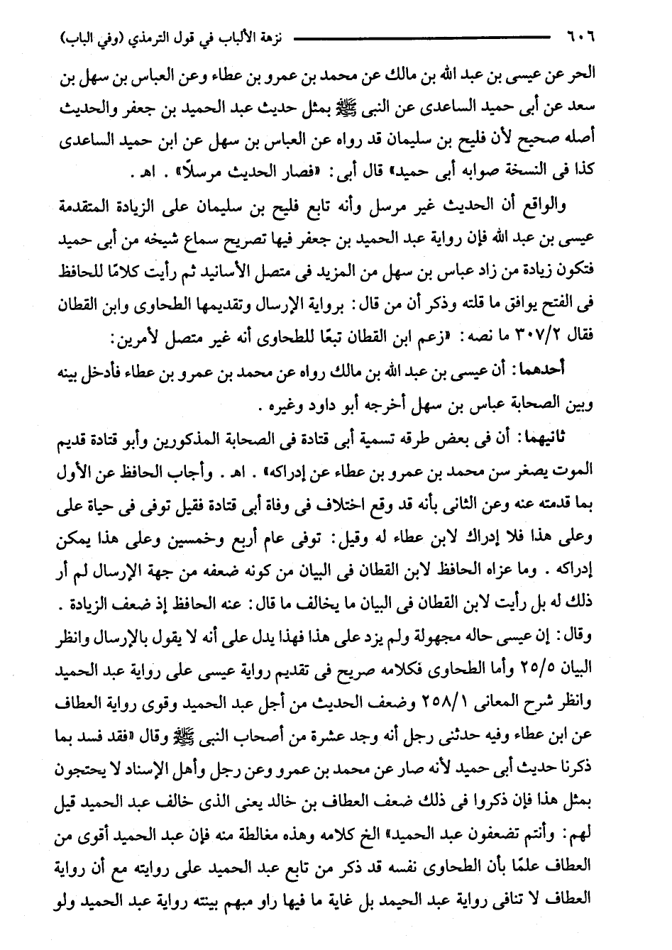 ثانيهما: أن في بعض طرقه تسمية أبى قتادة في الصحابة المذكورين وأبو قتادة قديم الموت يصغر سن محمد بن عمرو بن عطاء عن إدراكه". اهـ. وأجاب الحافظ عن الأول بما قدمته عنه وعن الثانى بأنه قد وقع اختلاف في وفاة أبى قتادة فقيل توفى في حياة على وعلى هذا فلا إدراك لابن عطاء له وقيل: توفى عام أربع وخمسين وعلى هذا يمكن إدراكه. وما عزاه الحافظ لابن القطان في البيان من كونه ضعفه من جهة الإرسال لم أر ذلك له بل رأيت لابن القطان في البيان ما يخالف ما قال: عنه الحافظ إذ ضعف الزيادة. وقال: إن عيسى حاله مجهولة ولم يزد على هذا فهذا يدل على أنه لا يقول بالإرسال وانظر البيان 5/ 25 وأما الطحاوى فكلامه صريح في تقديم رواية عيسى على رواية عبد الحميد وانظر شرح المعانى 1/ 258 وضعف الحديث من أجل عبد الحميد وقوى رواية العطاف عن ابن عطاء وفيه حدثنى رجل أنه وجد عشرة من أصحاب النبي - صلى الله عليه وسلم - وقال "فقد فسد بما ذكرنا حديث أبى حميد لأنه صار عن محمد بن عمرو وعن رجل وأهل الإسناد لا يحتجون بمثل هذا فإن ذكروا في ذلك ضعف العطاف بن خالد يعنى الذى خالف عبد الحميد قيل لهم: وأنتم تضعفون عبد الحميد" الخ كلامه وهذه مغالطة منه فإن عبد الحميد أقوى من العطاف علمًا بأن الطحاوى نفسه قد ذكر من تابع عبد الحميد على روايته مع أن رواية العطاف لا تنافى رواية عبد الحميد بل غاية ما فيها راو مبهم بينته رواية عبد الحميد ولو