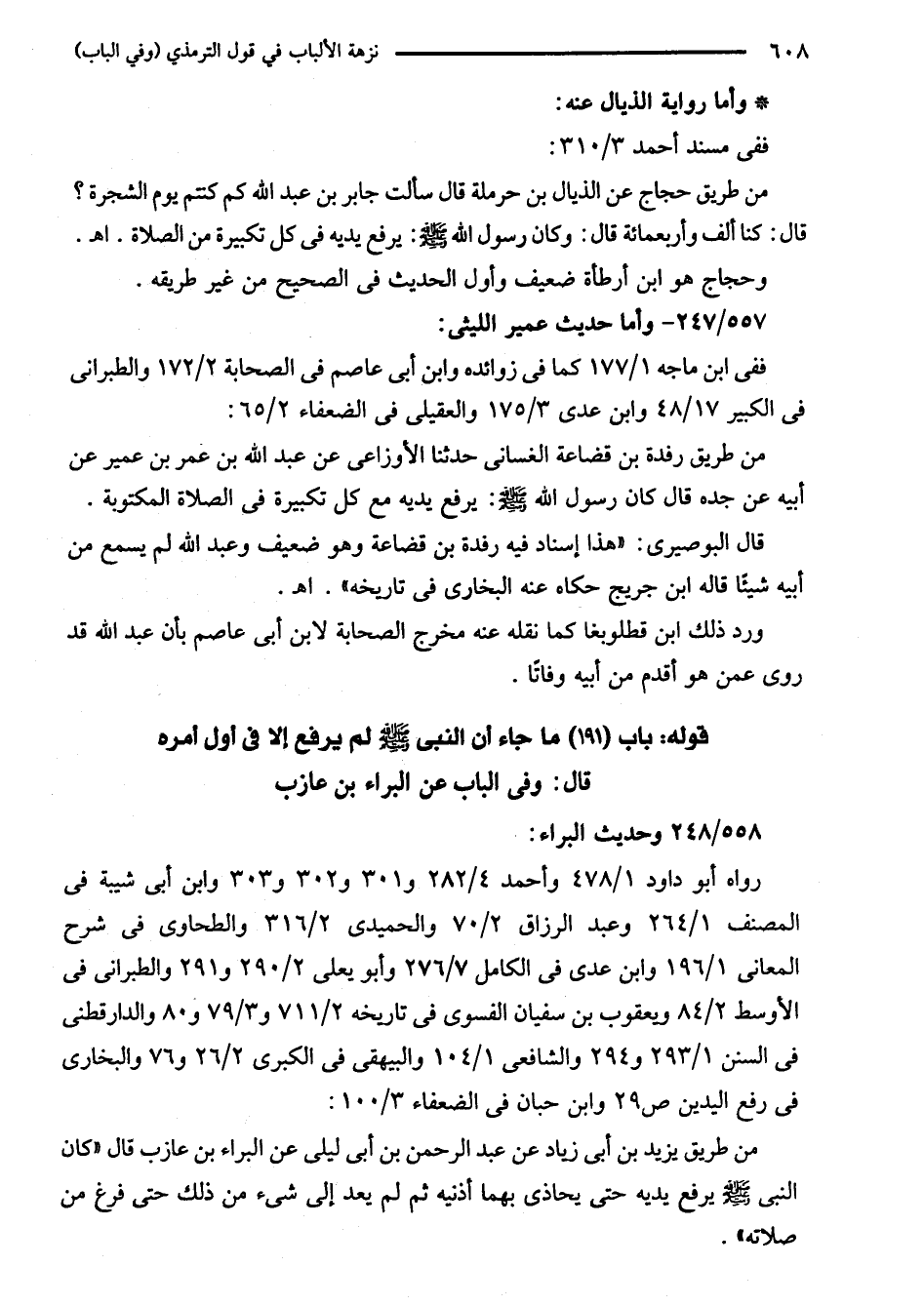 رواه أبو داود 1/ 478 وأحمد 4/ 282 و 301 و 302 و 303 وابن أبى شيبة في المصنف 1/ 264 وعبد الرزاق 2/ 70 والحميدي 2/ 316 والطحاوى في شرح المعانى 1/ 196 وابن عدى في الكامل 7/ 276 وأبو يعلى 2/ 290 و 291 والطبراني في الأوسط 2/ 84 ويعقوب بن سفيان الفسوى في تاريخه 2/ 711 و 3/ 79 و 80 والدارقطني في السنن 1/ 293 و 294 والشافعى 1/ 104 والبيهقي في الكبرى 2/ 26 و 76 والبخاري في رفع اليدين ص 29 وابن حبان في الضعفاء 3/ 100: