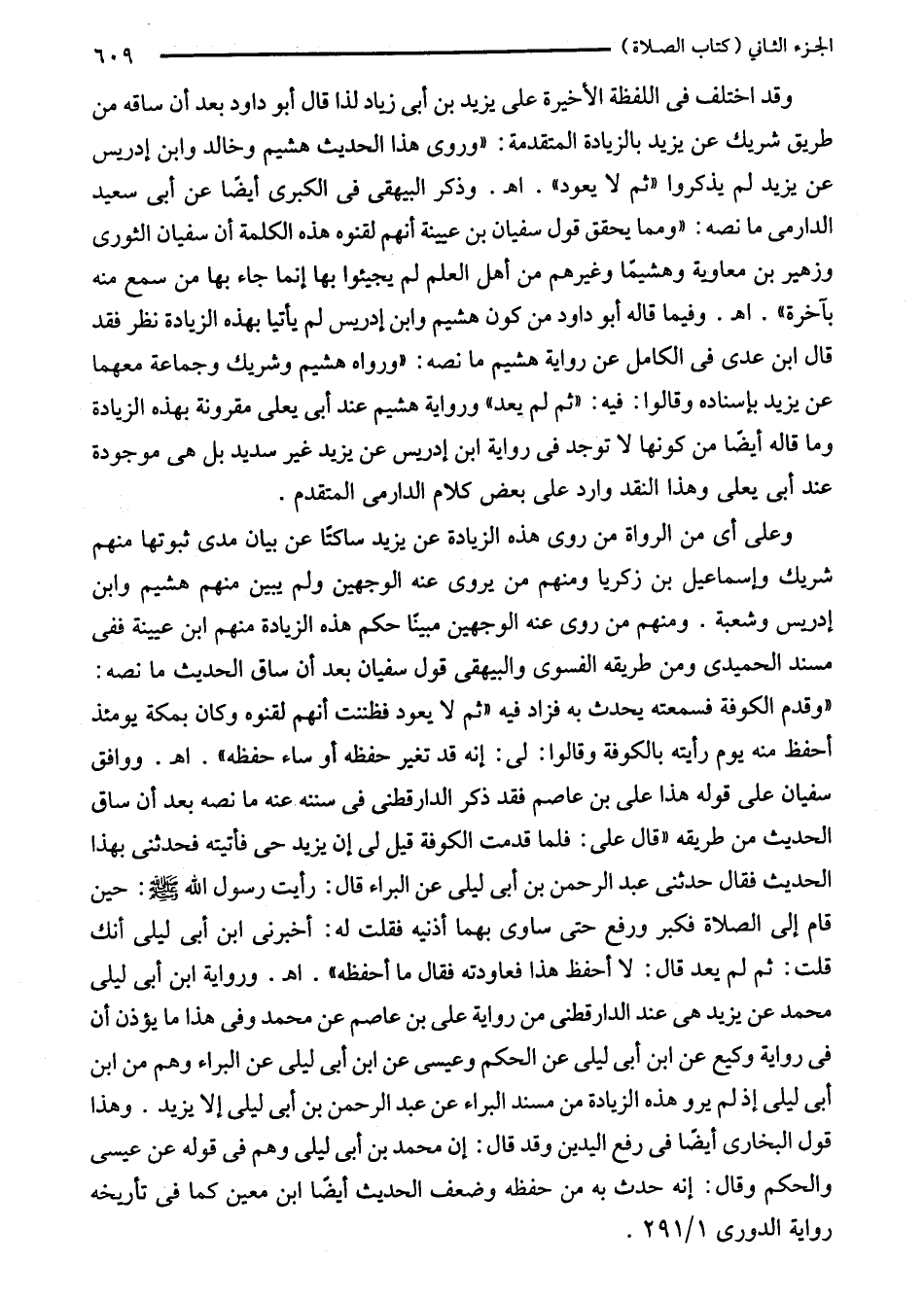 مسند الحميدي ومن طريقه الفسوى والبيهقي قول سفيان بعد أن ساق الحديث ما نصه: "وقدم الكوفة فسمعته يحدث به فزاد فيه "ثم لا يعود فظننت أنهم لقنوه وكان بمكة يومئذ أحفظ منه يوم رأيته بالكوفة وقالوا: لى: إنه قد تغير حفظه أو ساء حفظه". اهـ. ووافق سفيان على قوله هذا على بن عاصم فقد ذكر الدارقطني في سننه عنه ما نصه بعد أن ساق الحديث من طريقه "قال على: فلما قدمت الكوفة قيل لى إن يزيد حى فأتيته فحدثنى بهذا الحديث فقال حدثنى عبد الرحمن بن أبى ليلى عن البراء قال: رأيت رسول الله - صلى الله عليه وسلم -: حين قام إلى الصلاة فكبر ورفع حتى ساوى بهما أذنيه فقلت له: أخبرنى ابن أبى ليلى أنك قلت: ثم لم يعد قال: لا أحفظ هذا فعاودته فقال ما أحفظه". اهـ. ورواية ابن أبى ليلى محمد عن يزيد هي عند الدارقطني من رواية على بن عاصم عن محمد وفى هذا ما يؤذن أن في رواية وكيع عن ابن أبى ليلى عن الحكم وعيسى عن ابن أبى ليلى عن البراء وهم من ابن أبى ليلى إذ لم يرو هذه الزيادة من مسند البراء عن عبد الرحمن بن أبى ليلى إلا يزيد. وهذا قول البخاري أيضًا في رفع اليدين وقد قال: إن محمد بن أبى ليلى وهم في قوله عن عيسى والحكم وقال: إنه حدث به من حفظه وضعف الحديث أيضًا ابن معين كما في تأريخه رواية الدورى 1/ 291.