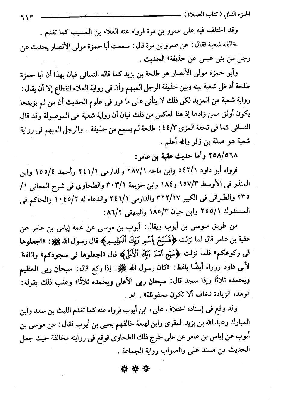 من طريق موسى بن أيوب ويقال: أيوب بن موسى عن عمه إياس بن عامر عن عقبة بن عامر قال لما نزلت {فَسَبِّحْ بِاسْمِ رَبِّكَ الْعَظِيمِ} قال رسول الله - صلى الله عليه وسلم -: "اجعلوها في ركوعكم" فلما نزلت {سَبِّحِ اسْمَ رَبِّكَ الْأَعْلَى} قال "اجعلوها في سجودكم" واللفظ لأبى داود ورواه أيضًا بلفظ: "كان رسول الله - صلى الله عليه وسلم -: إذا ركع قال: سبحان ربي العظيم وبحمده ثلاثًا وإذا سجد قال: سبحان ربي الأعلى وبحمده ثلاثًا" وعقب ذلك بقوله: "وهذه الزيادة نخاف ألا تكون محفوظة". اهـ.