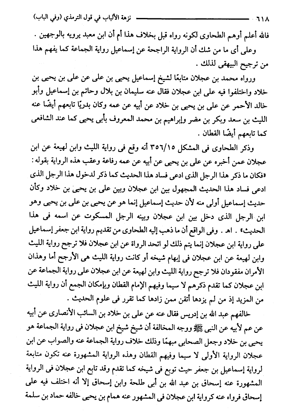 وذكر الطحاوى في المشكل 15/ 356 أنه وقع في رواية الليث وابن لهيعة عن ابن عجلان عمن أخبره عن على بن يحيى عن أبيه عن عمه رفاعة وعقب هذه الرواية بقوله: "فكان ما ذكر هذا الرجل الذى ادعى فساد هذا الحديث كما ذكر لدخول هذا الرجل الذى ادعى فساد هذا الحديث المجهول بين ابن عجلان وبين على بن يحيى بن خلاد وكأن حديث إسماعيل أولى منه لأن حديث إسماعيل إنما هو عن يحيى بن على بن يحيى وهو ابن الرجل الذى دخل بين ابن عجلان وبينه الرجل المسكوت عن اسمه في هذا الحديث". اهـ. وفى الواقع أن ما ذهب إليه الطحاوى من تقديم رواية ابن جعفر إسماعيل على رواية ابن عجلان إنما يتم ذلك لو اتحد الرواة عن ابن عجلان فلا ترجح رواية الليث وابن لهيعة عن ابن عجلان في إبهام شيخه أو كانت رواية الليث هي الأرجح أما وهذان الأمران مفقودان فلا ترجح رواية الليث وابن لهيعة عن ابن عجلان على رواية الجماعة عن ابن عجلان كما تقدم ذكرهم لا سيما وفيهم الإمام القطان وبإمكان الجمع أن رواية الليث من المزيد إذ من لم يزدها أتقن ممن زادها كما تقرر في علوم الحديث.