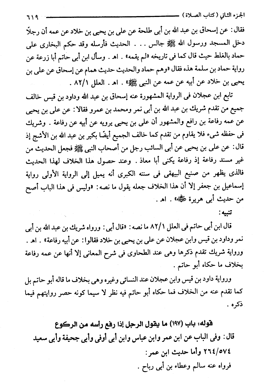 تابع ابن عجلان في الرواية المشهورة عنه إسحاق بن عبد الله وداود بن قيس خالف جميع من تقدم شريك بن عبد الله بن أبى نمر ومحمد بن عمرو فقالا: عن على بن يحيى عن عمه رفاعة بن رافع والمشهور أن على بن يحيى يرويه عن أبيه عن رفاعة. وشريك في حفظه شىء فلا يقاوم من تقدم كما خالف الجميع أيضًا بكير بن عبد الله بن الأشج إذ قال: عن على بن يحيى عن أبى السائب رجل من أصحاب النبي - صلى الله عليه وسلم - فجعل الحديث من غير مسند رفاعة إذ رفاعة يكنى أبا معاذ. وعند حصول هذا الخلاف لهذا الحديث فالذى يظهر من صنيع البيهقي في سننه الكبرى أنه يميل إلى الرواية الأولى رواية إسماعيل بن جعفر إلا أن هذا الخلاف جعله يقول ما نصه: "وليس في هذا الباب أصح من حديث أبى هريرة - رضي الله عنه -". اهـ.