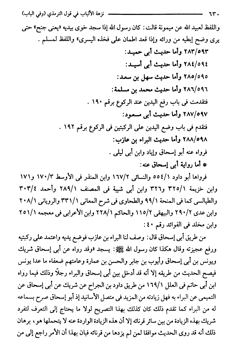 من طريق أبى إسحاق قال: وصف لنا البراء بن عازب فوضع يديه واعتمد على ركبتيه ورفع عجيزته وقال هكذا كان رسول الله - صلى الله عليه وسلم -: يسجد "وقد رواه عن أبى إسحاق شريك ويونس بن أبى إسحاق وأيوب بن جابر والحسن بن عمارة وعامتهم ضعفاء ما عدا يونس فيصح الحديث من طريقه إلا أنه قد أدخل بين أبى إسحاق والبراء رجلًا وذلك فيما رواه ابن أبى حاتم في العلل 1/ 169 من طريق داود بن الجراح عن شريك عن أبى إسحاق عن التميمى عن البراء به فهل زيادته من المزيد في متصل الأسانيد إذ أبو إسحاق صرح بسماعه له من البراء كما تقدم ذلك كان كذلك بهذا التصريح لولا ما يحتاج إلى التعرف لتفرد شريك بهذه الزيادة من بين سائر قرنائه إلا أن هذه الزيادة الواردة عنه لا يتحملها هو، برهان ذلك أنه قد روى الحديث موافقا لمن لم يزدها من قرنائه فبان بهذا أن الأمر راجع إلى من