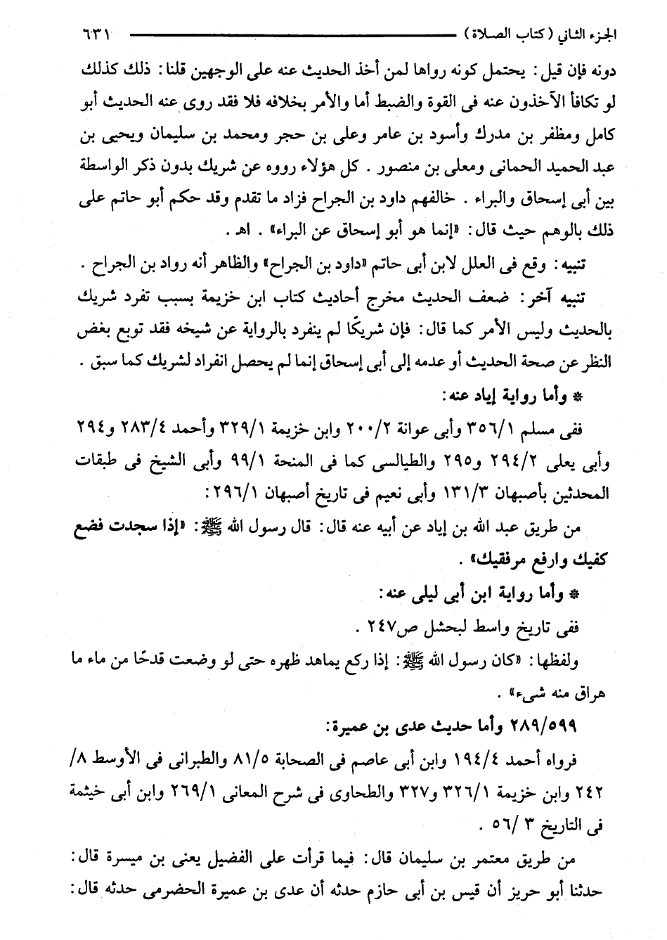 دونه فإن قيل: يحتمل كونه رواها لمن أخذ الحديث عنه على الوجهين قلنا: ذلك كذلك لو تكافأ الآخذون عنه في القوة والضبط أما والأمر بخلافه فلا فقد روى عنه الحديث أبو كامل ومظفر بن مدرك وأسود بن عامر وعلى بن حجر ومحمد بن سليمان ويحيى بن عبد الحميد الحمانى ومعلى بن منصور. كل هؤلاء رووه عن شريك بدون ذكر الواسطة بين أبى إسحاق والبراء. خالفهم داود بن الجراح فزاد ما تقدم وقد حكم أبو حاتم على ذلك بالوهم حيث قال: "إنما هو أبو إسحاق عن البراء". اهـ.